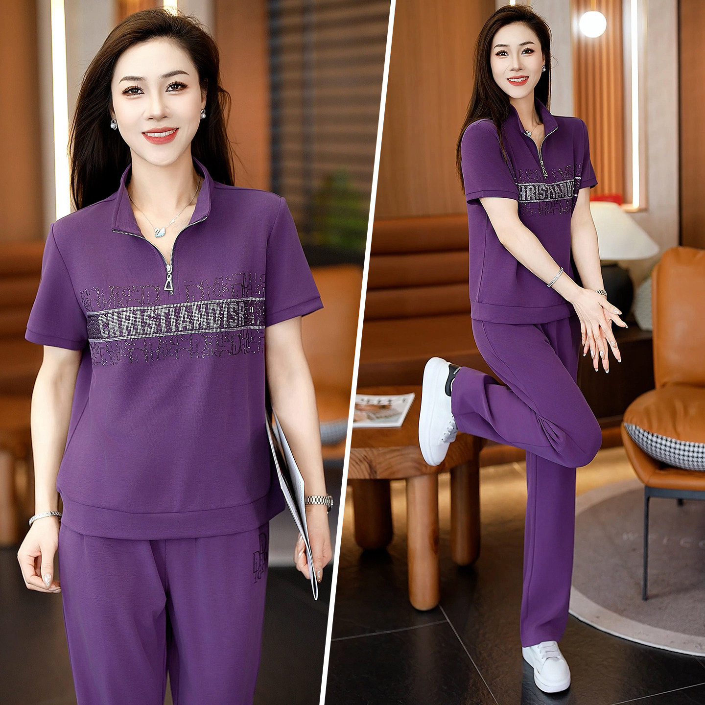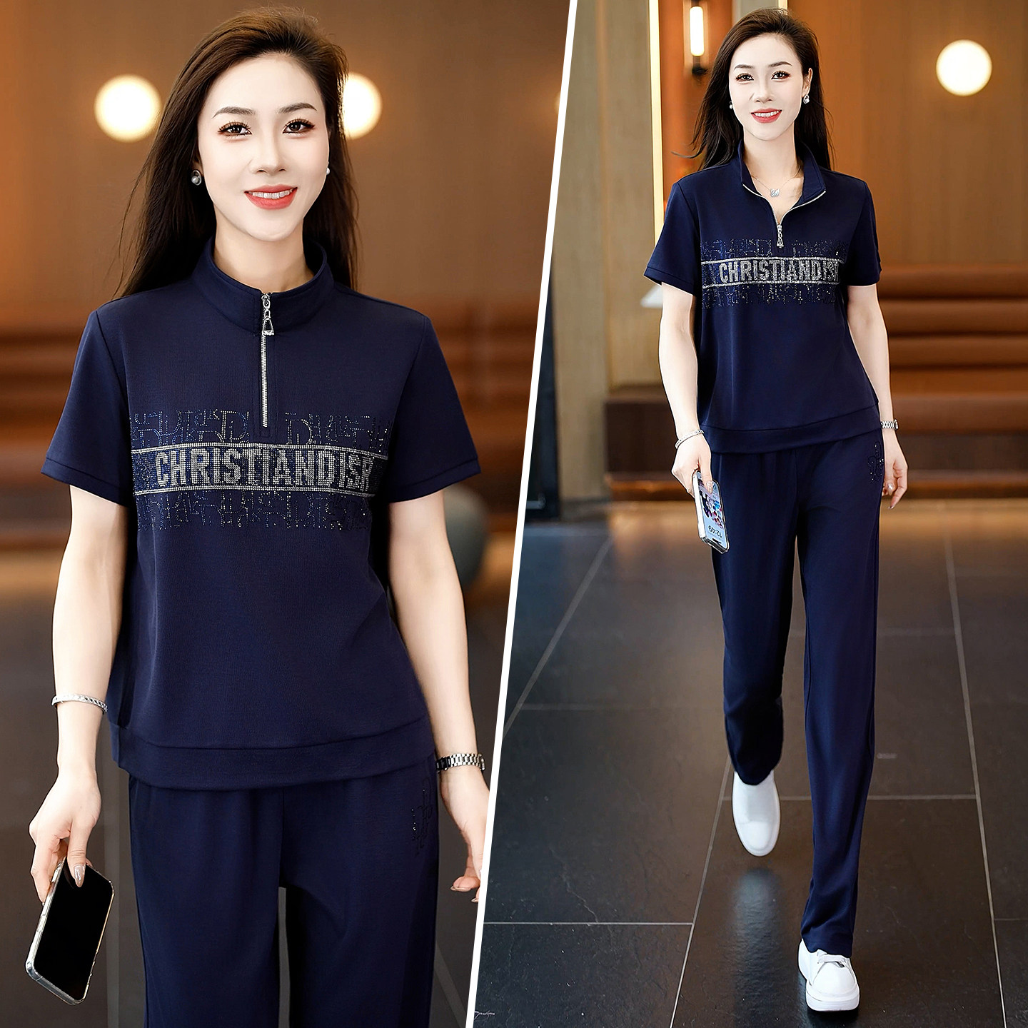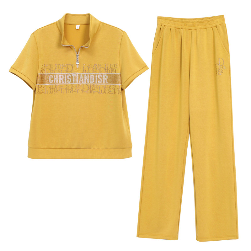 休闲风运动套装 洋气减龄立领短袖 长裤 显瘦跑步两件套 女夏2026新款