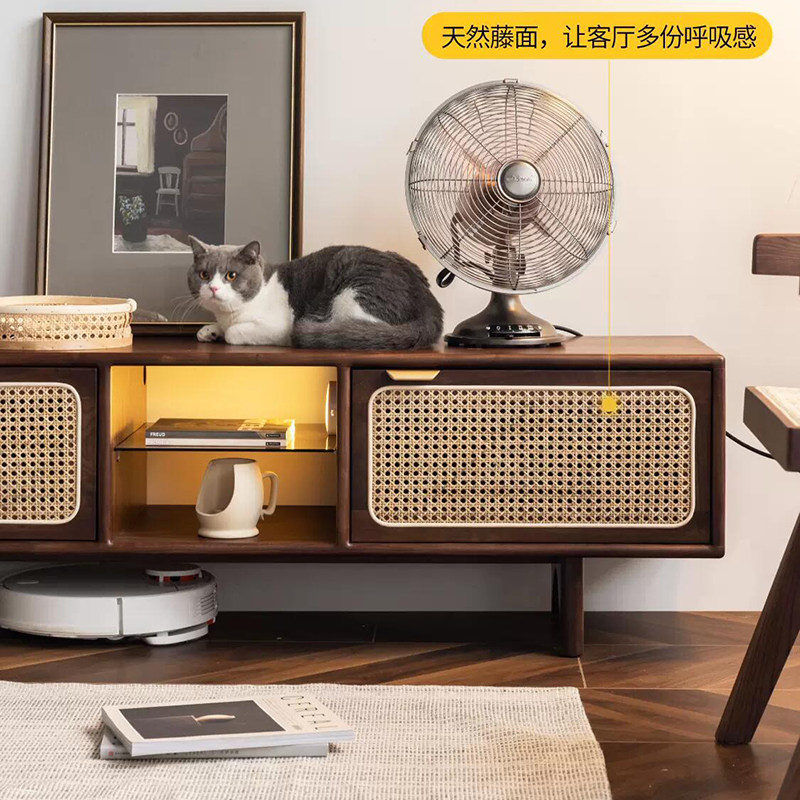 西提复古日式 中古家具胡桃木客厅视听藤编柜 电视柜北欧NICE黑风格