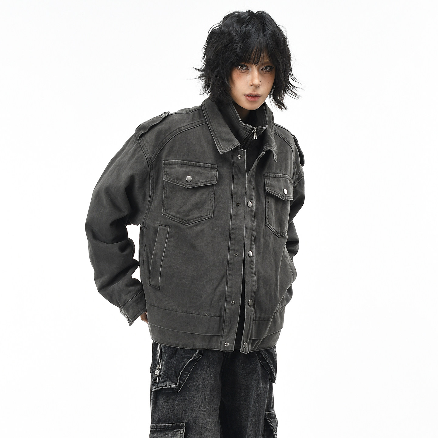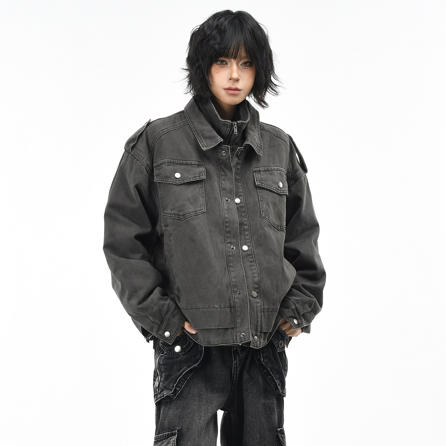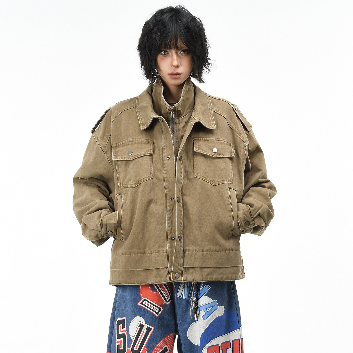 棉服外套女冬季 假两件boxy短宽保暖棉衣男 复古水洗工装 OV原创美式