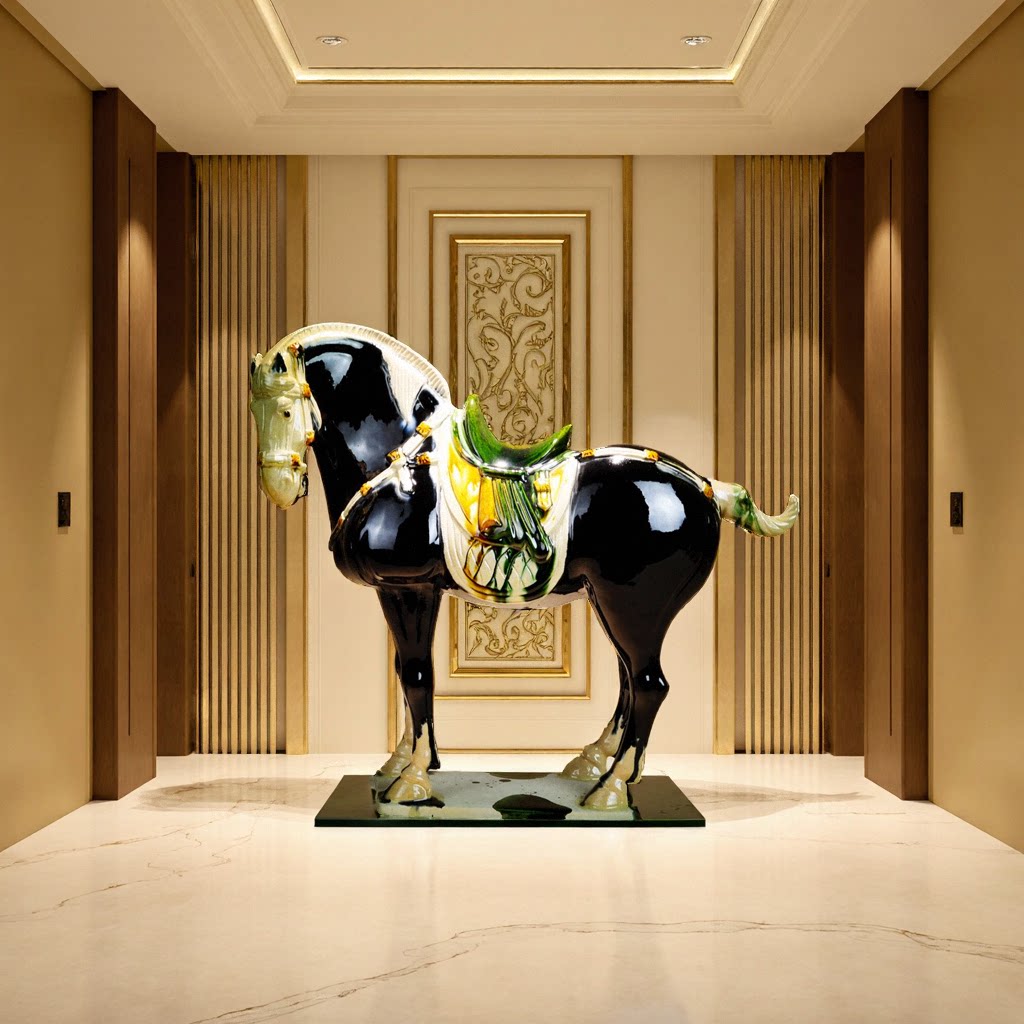仿古法唐三彩中国马黑马摆件别墅酒店中式 饰 复古陶瓷艺术品客厅装由