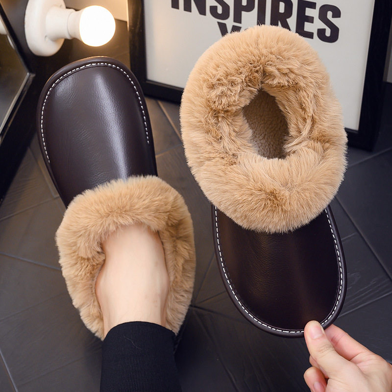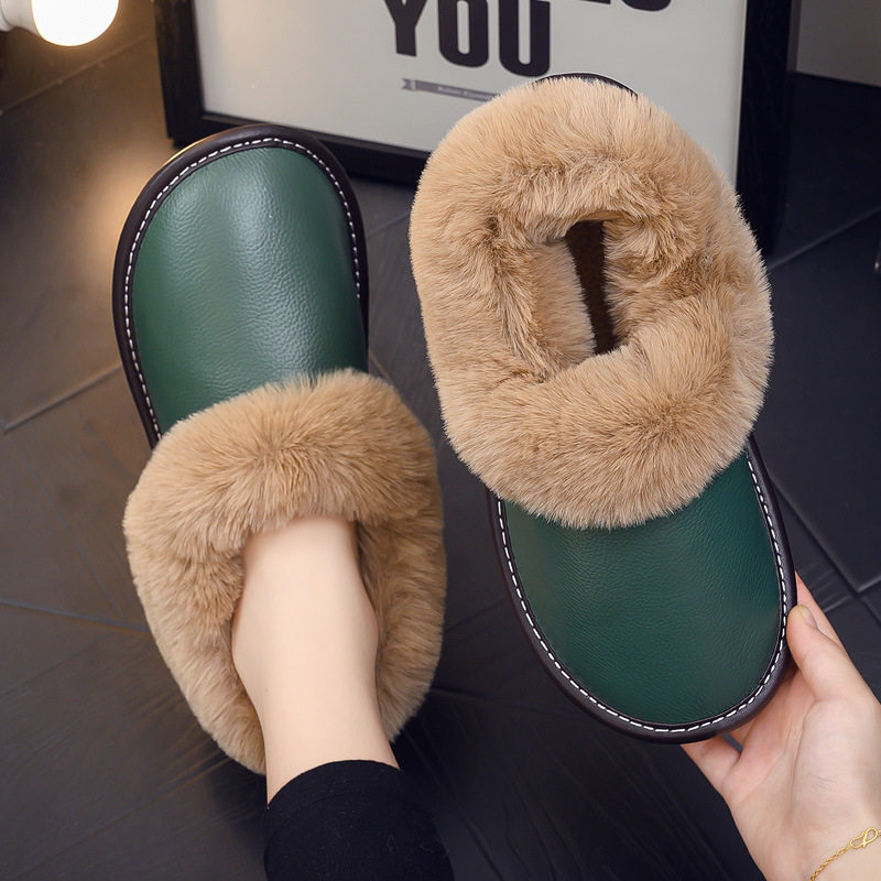 老人居家室内牛筋底防滑加绒保暖棉鞋 牛皮真皮棉拖鞋 全包带跟冬季