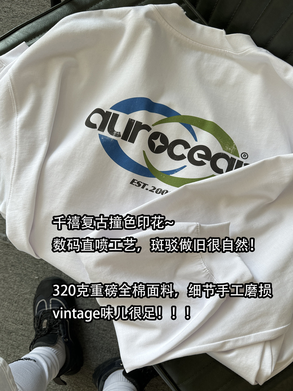 Aurocean T恤 320克重磅全棉千禧复古数码 印磨损做旧打底 白色长袖