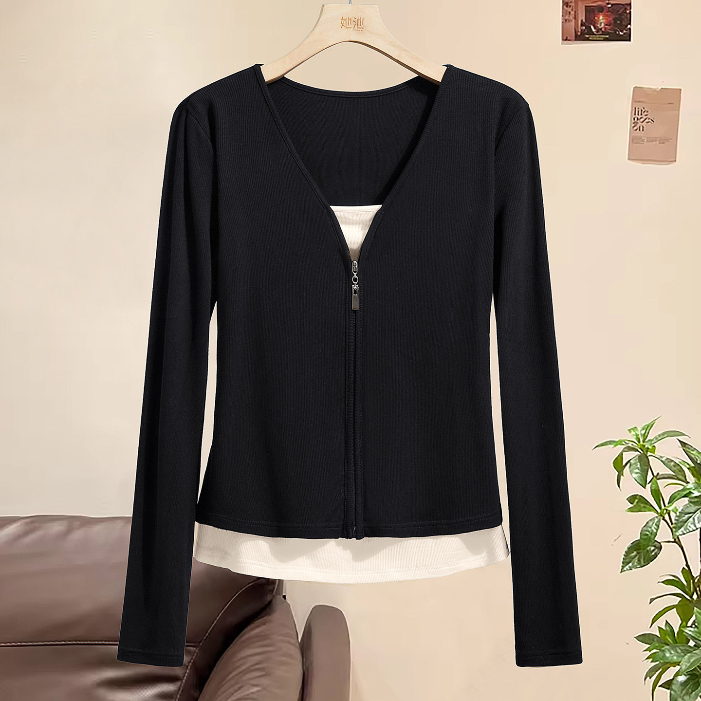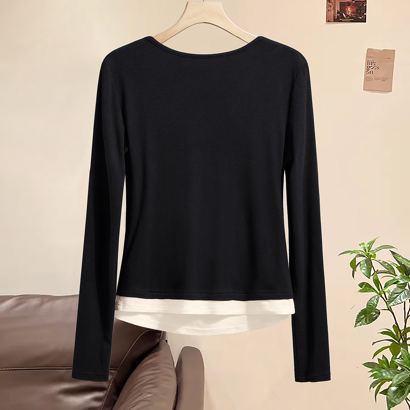 女装 新款 2026春装 V领上衣 修身 撞色拼接长袖 时尚 她池假两件打底衫