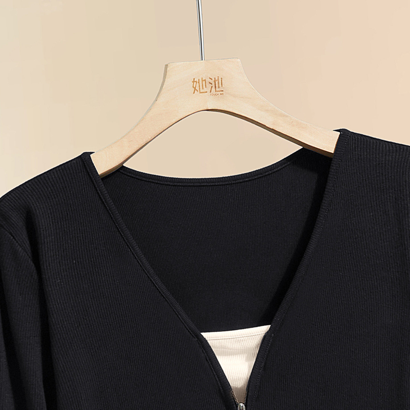 女装 新款 2026春装 V领上衣 修身 撞色拼接长袖 时尚 她池假两件打底衫由