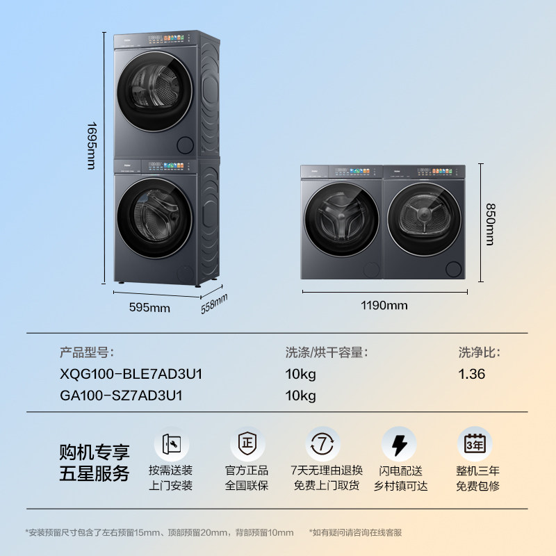 海尔高配版 云溪5.0 家用全自动双擎热泵洗衣机 10kg洗烘套装由
