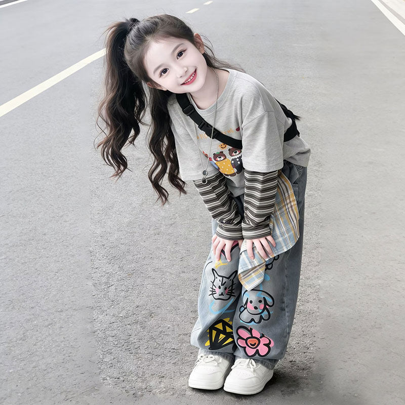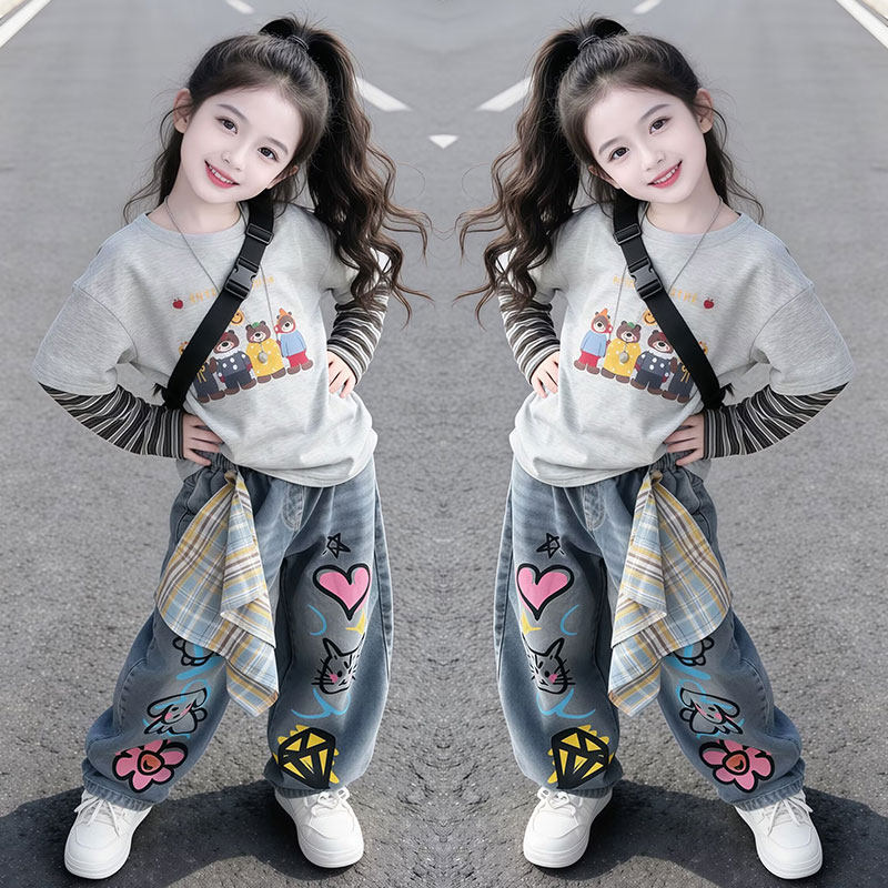 为您提供商品女童春季 2026新款 儿童拼接上衣中大童超洋气涂鸦牛仔裤 两件套 套装的详细介绍,