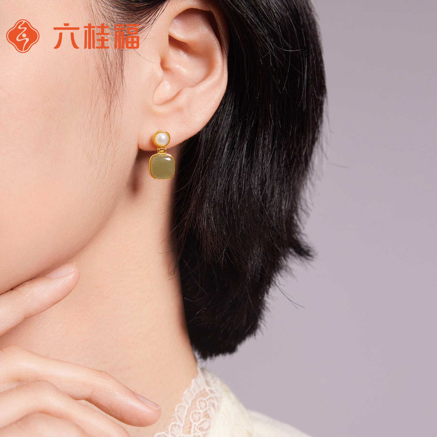 淘宝网为您提供商品六桂福珠宝黄金色S925银镶嵌和田玉耳坠珍珠耳针耳饰送老婆礼物的详细介绍,