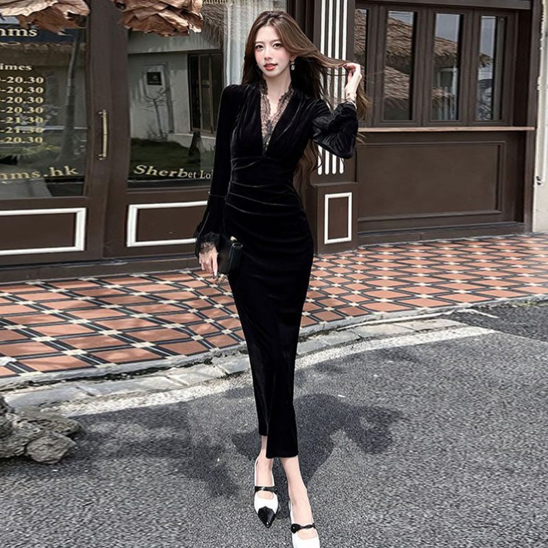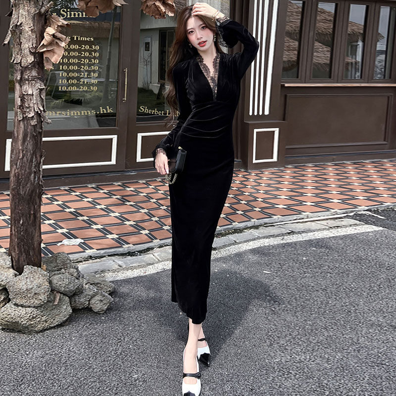 v领丝绒连衣裙女设计感蕾丝拼接长袖 名媛包臀长裙 气质修身 秋冬款