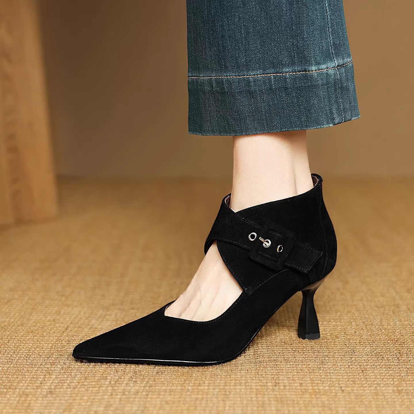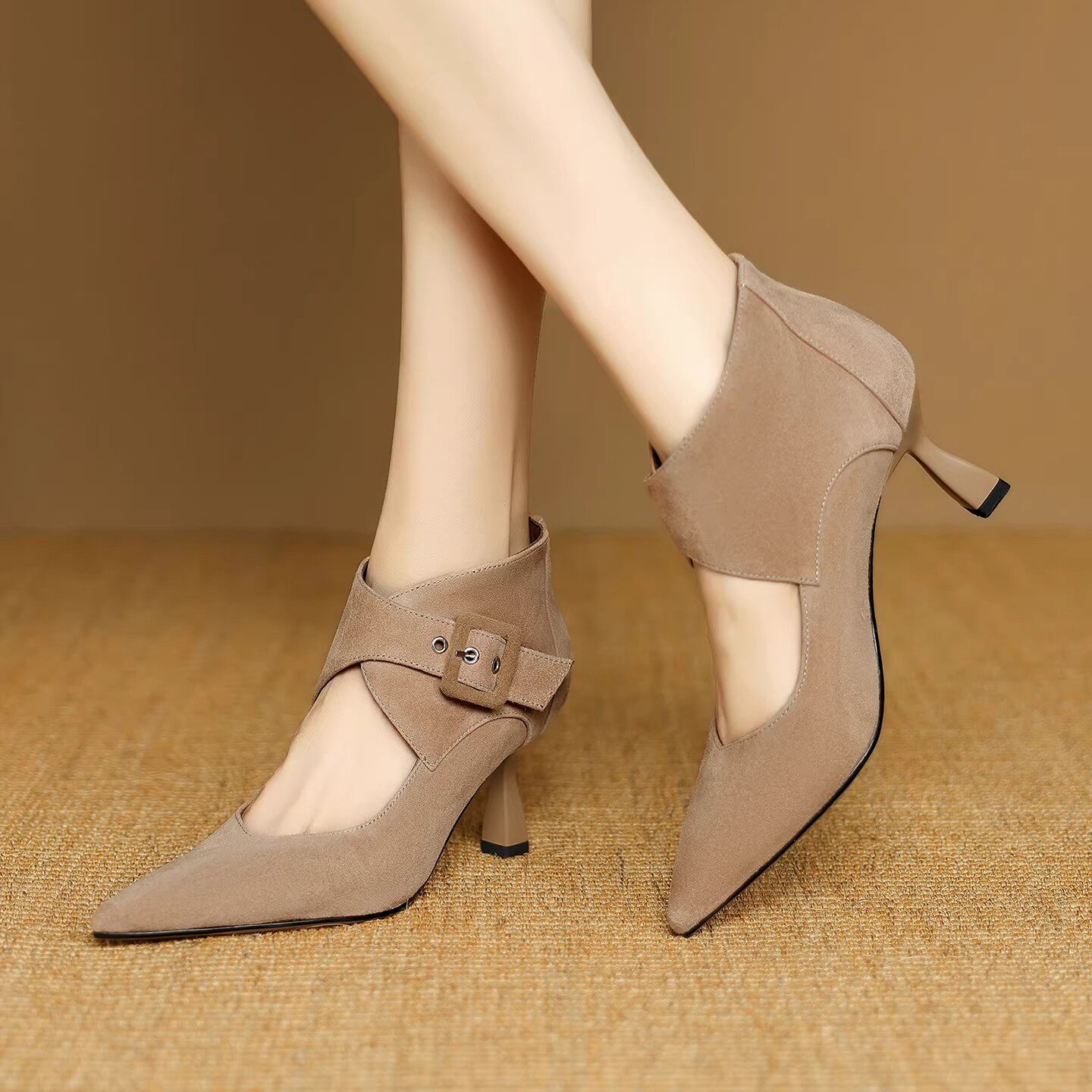 为您提供商品法式 春秋新款 尖头细跟皮带扣镂空踝靴高帮单鞋 磨砂真皮气质高跟鞋的详细介绍,