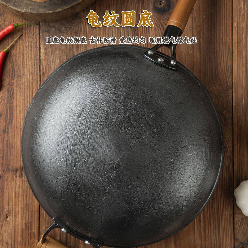 家用无涂层陆川圆底带把生铁铸铁锅电磁炉平底锅炒锅 龟纹铁锅老式由