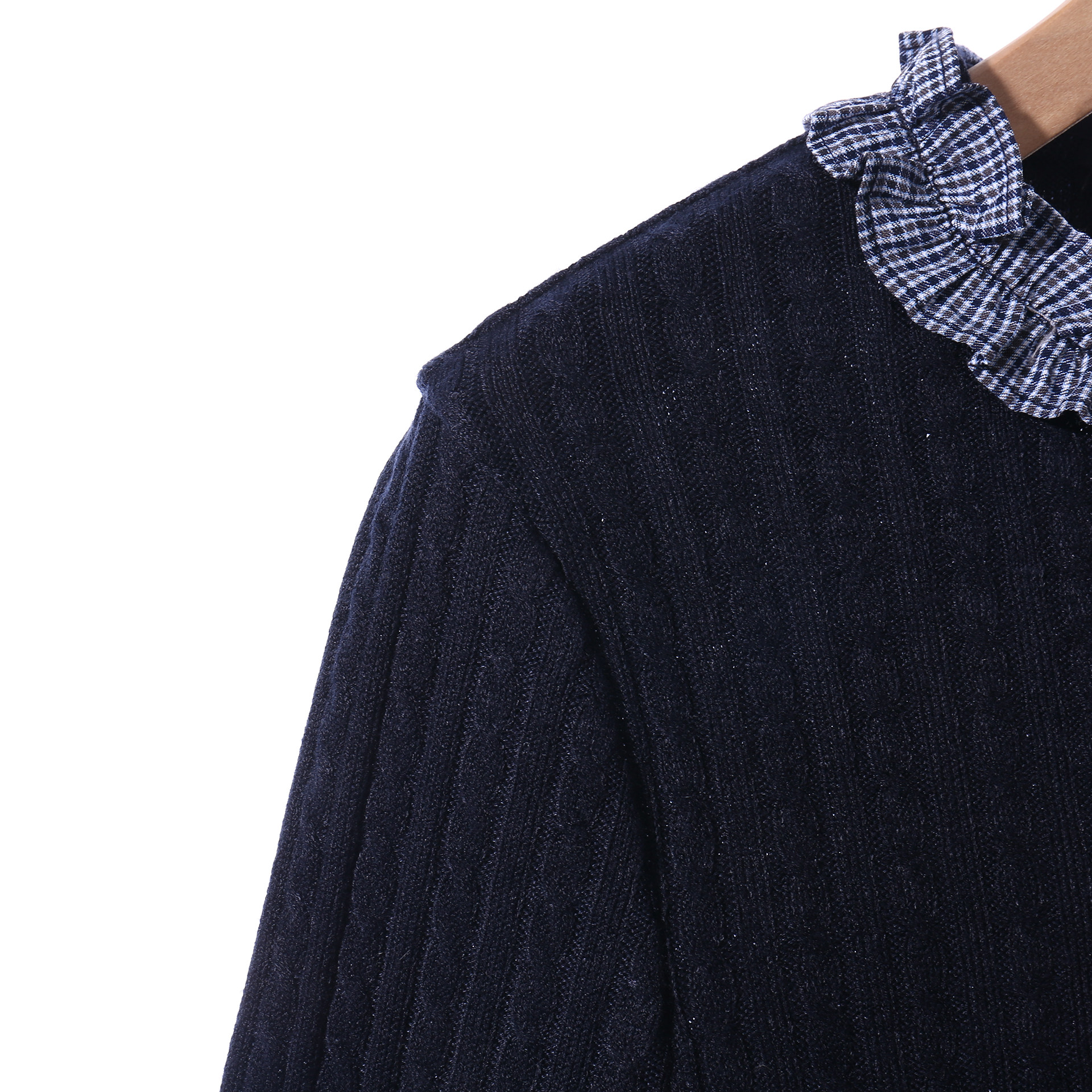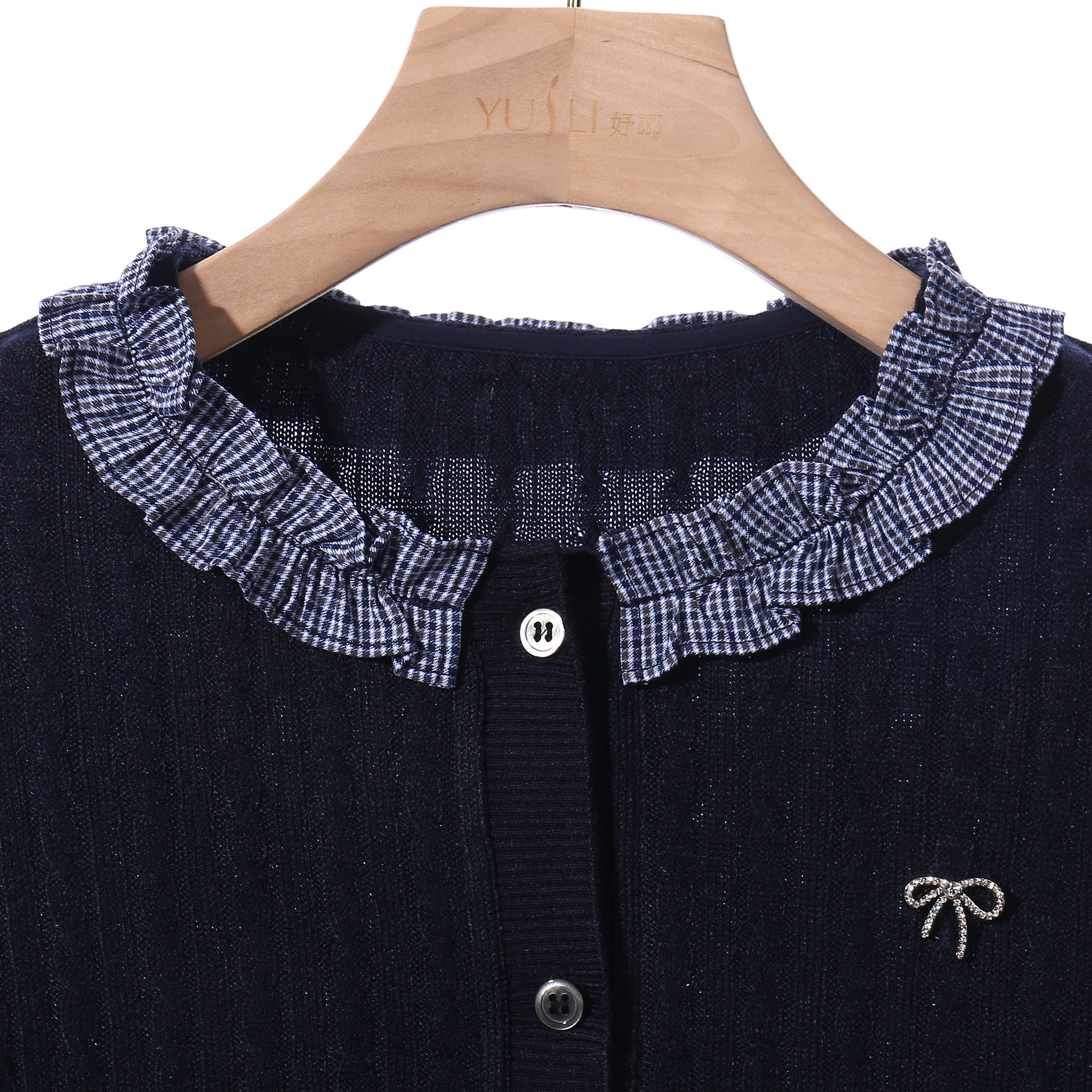 戈美 女2026年春季 新款 韩系圆领毛线 NA撞色格纹木耳花边针织开衫