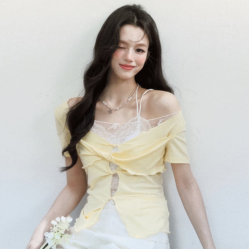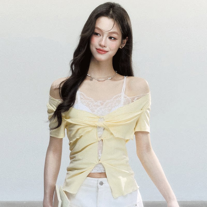 易碎商店·织梦者 7new t恤 韩系温柔风扭结上衣蕾丝镂空短袖