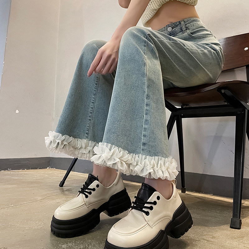155显瘦显高9分喇叭裤 女矮小个子148 白色木耳花边八分微喇牛仔裤
