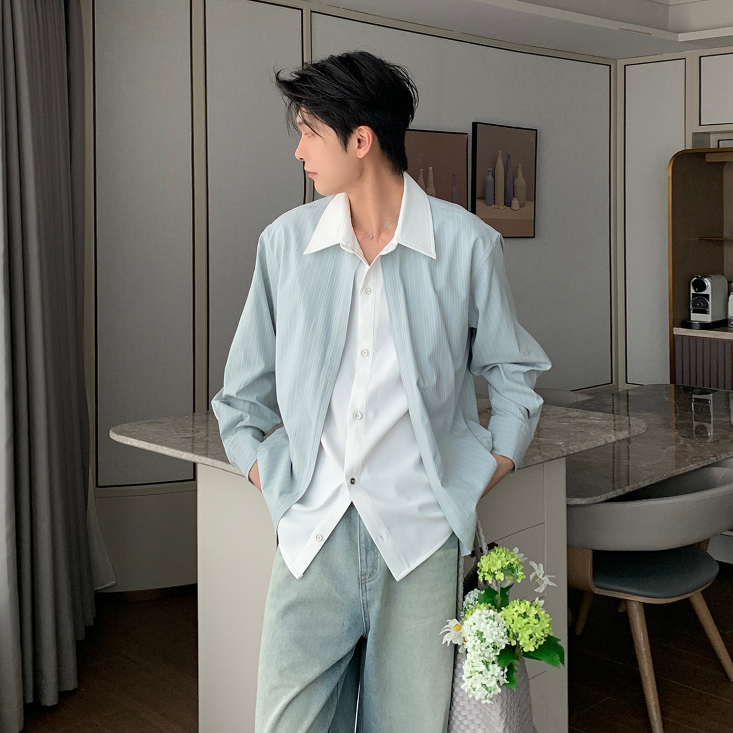 蓝色翻领水洗牛仔衬衫 秋季 宽松休闲纯色长袖 上衣外套 男生2026新款