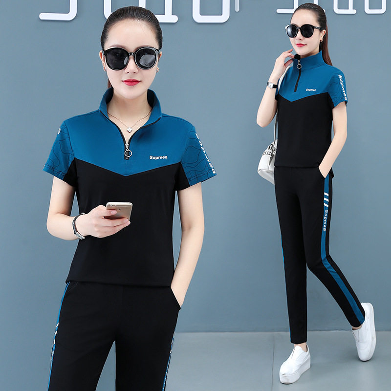 女韩版 两件套女 2021夏季 运动服套装 立领短袖 长裤 女装 新款 休闲大码