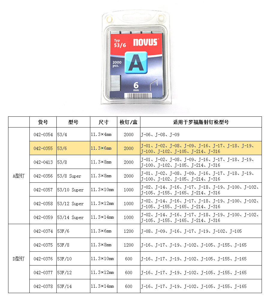为您提供商品6枪钉排钉2000枚11.3mm NOVUS罗福斯高强度射钉枪钉U型钉门型钉53的详细介绍,