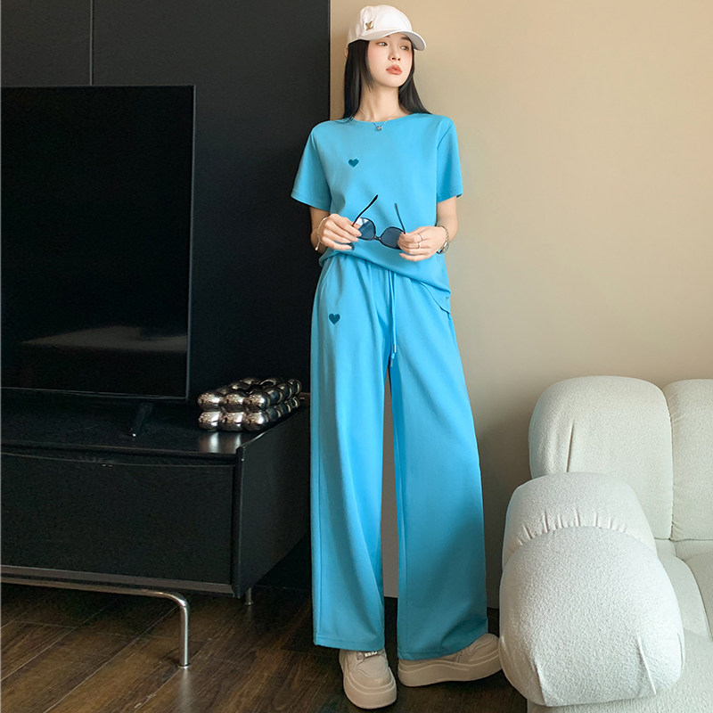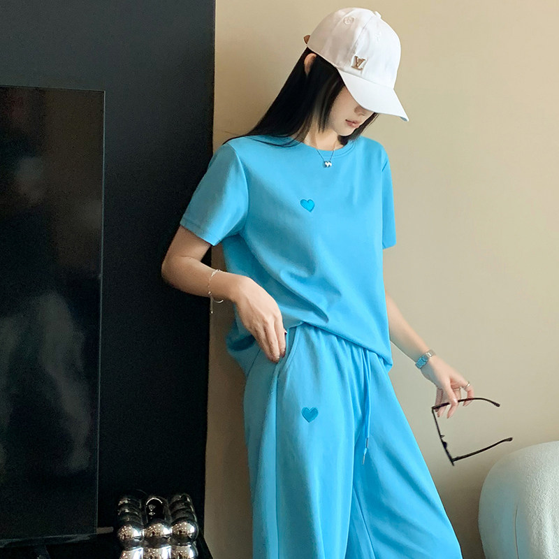 简约时尚 休闲短袖 运动套装 女夏季 两件套潮 洋气减龄宽松显瘦阔腿裤