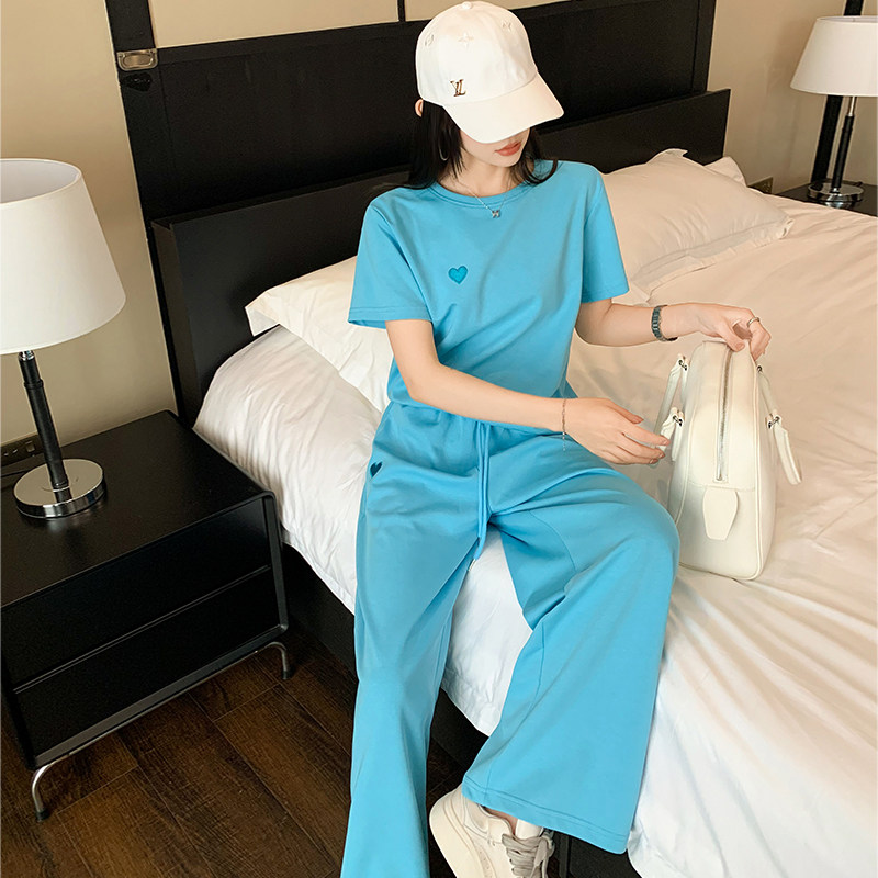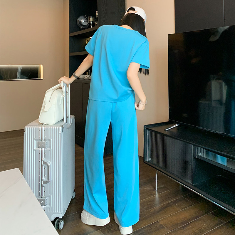 简约时尚 休闲短袖 运动套装 女夏季 两件套潮 洋气减龄宽松显瘦阔腿裤由