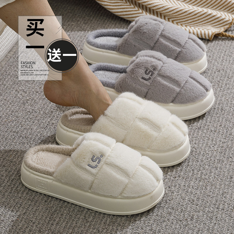 2双装 女冬季 室内居y家厚底防滑毛绒保暖踩屎感男士 棉拖 情侣棉拖鞋