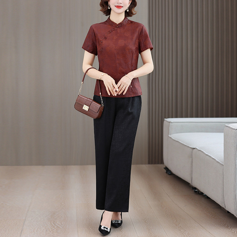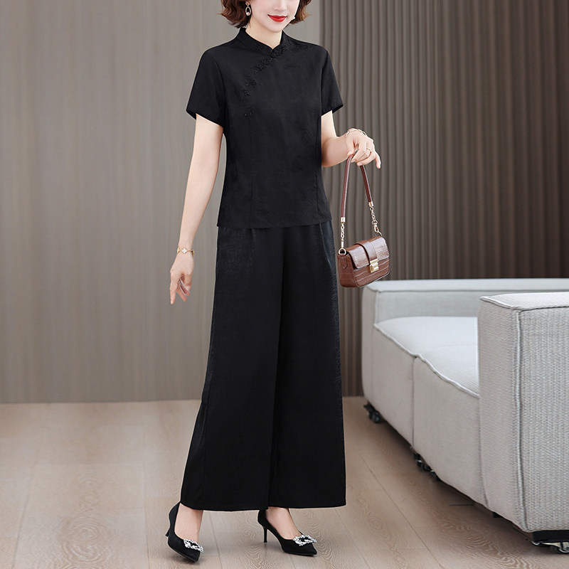 为您提供商品妈妈气质时尚 香云纱新中式 国风套装 夏季 两件套 真丝提花上衣阔腿裤的详细介绍,