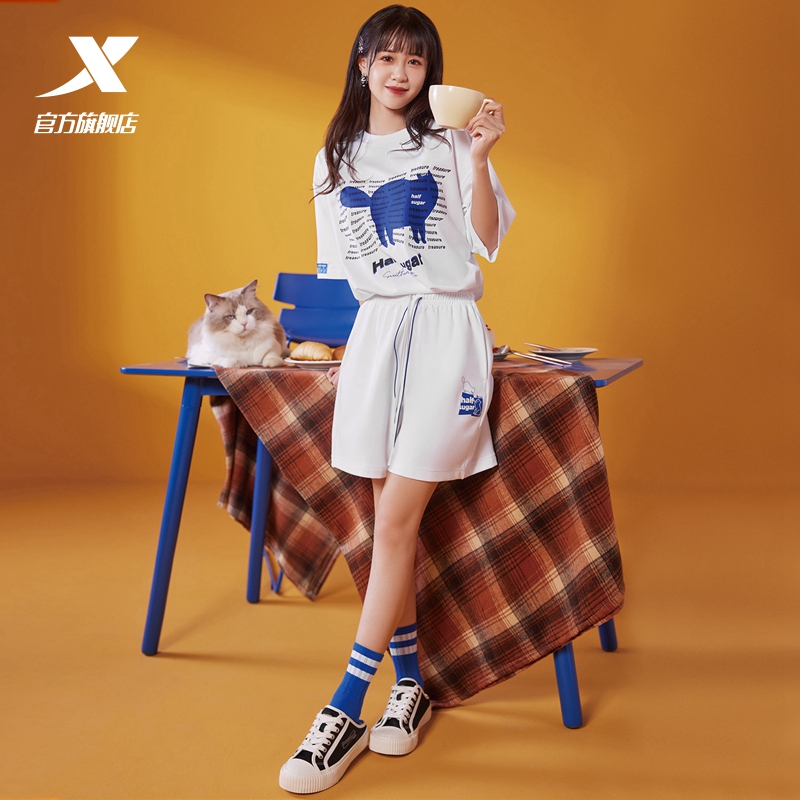 新款 运动针织宽松白色上衣情侣T恤 女夏季 特步半糖系列甜酷短袖