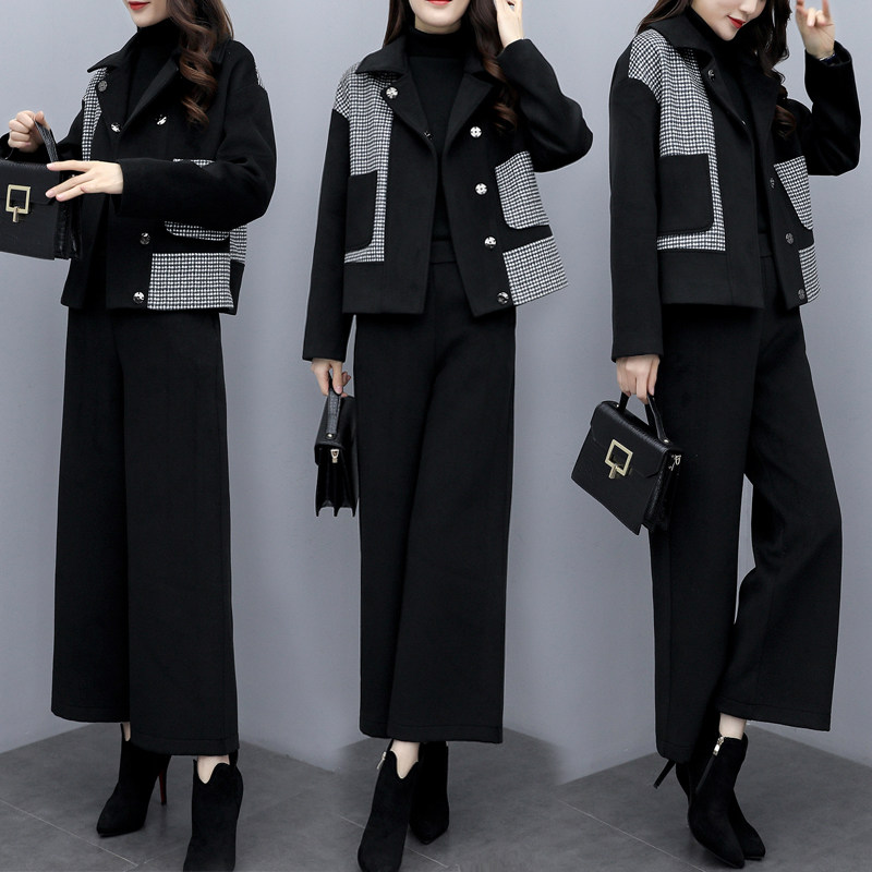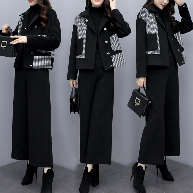 大码 2021新款 冬季 休闲时尚 套装 拼接E毛呢外套阔腿裤 女装 两件套裤由
