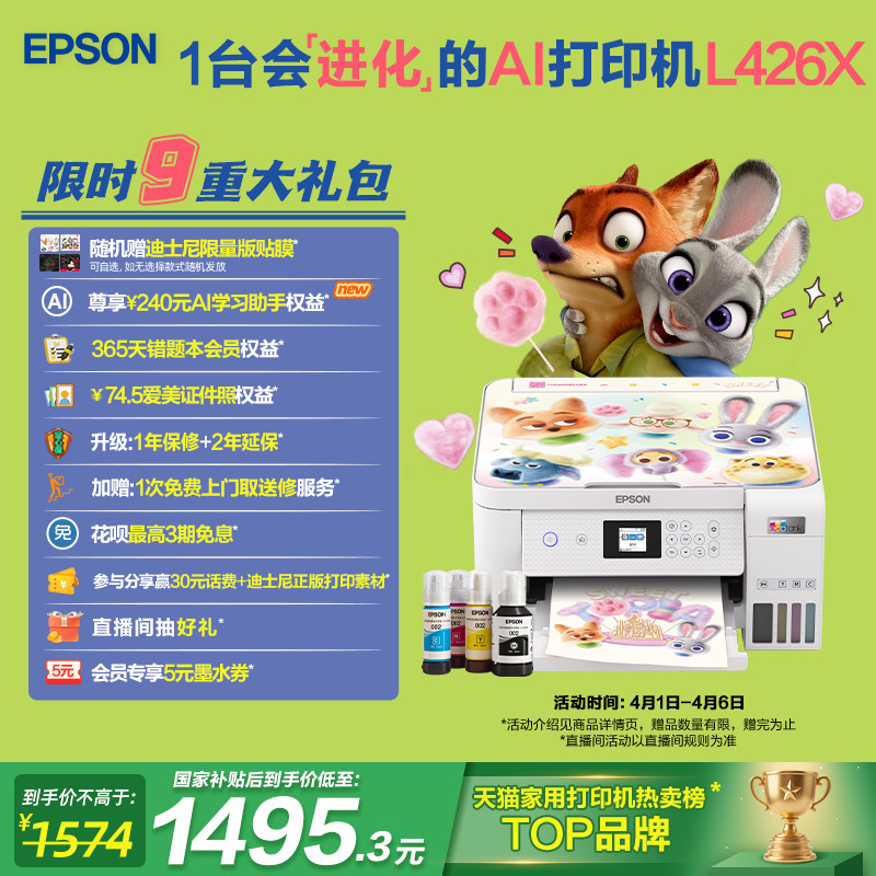 爱普生L4266 4268迪士尼系列墨仓式 打印机无线多功能喷墨一体机复印扫描照片自动双面 政府补贴