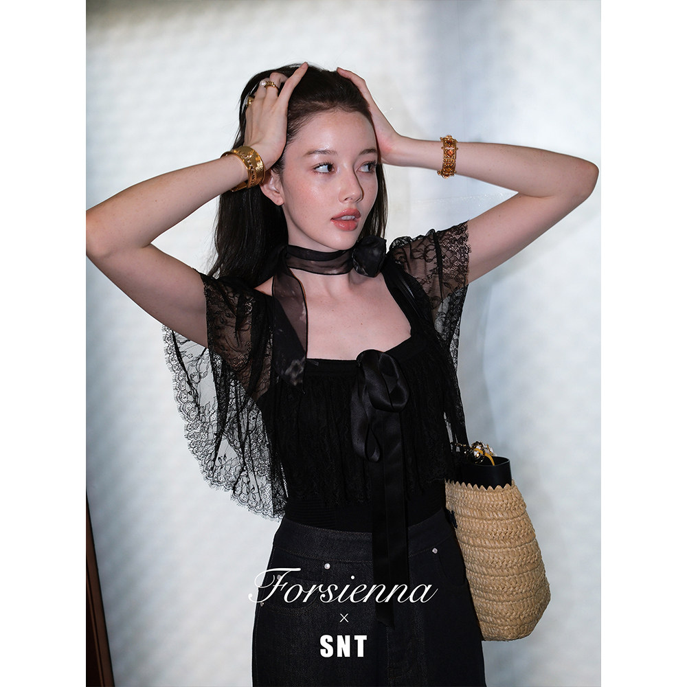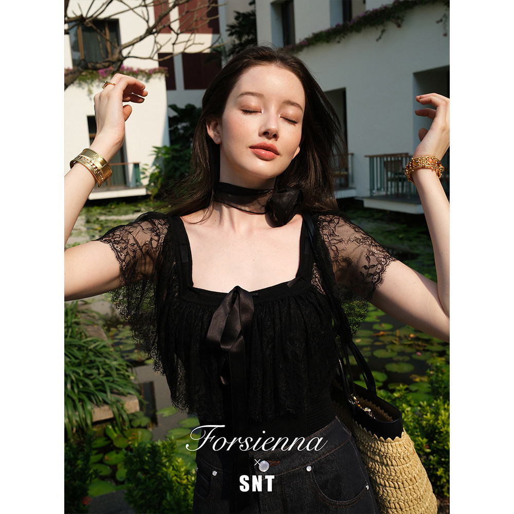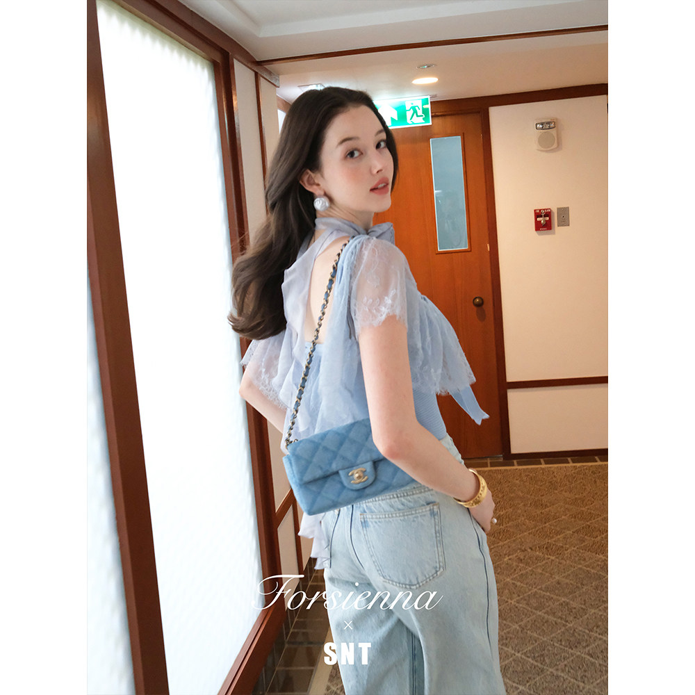 SNT Baby蓝 午夜黑两穿式 蕾丝拼接蝴蝶结显瘦针织上衣 浪漫对白