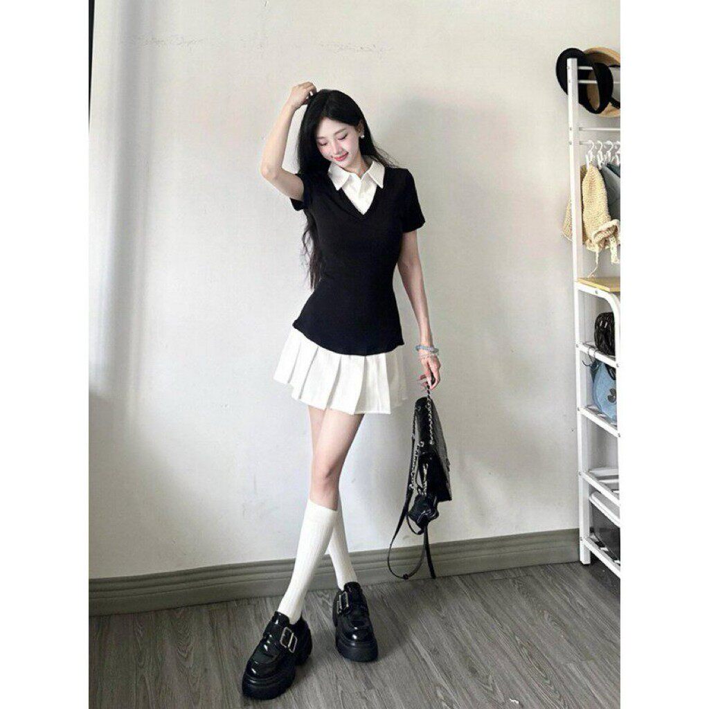 收腰新款 拼接百褶裙 夏季 2026学院假两件显瘦百褶连衣裙辣妹修身