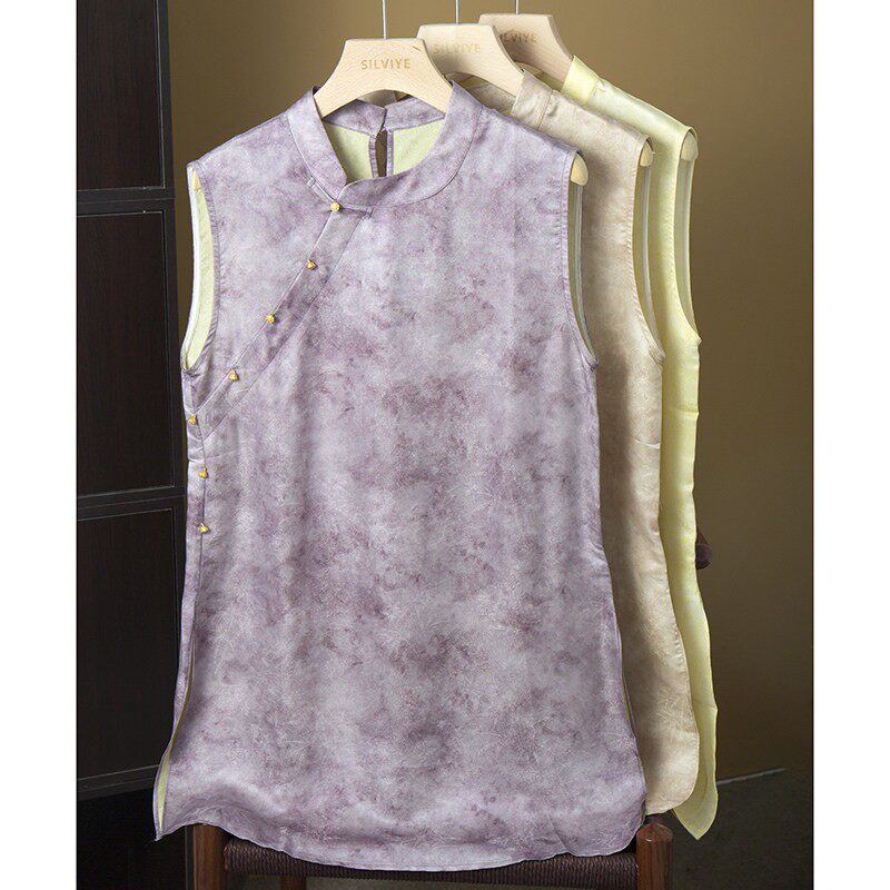 真丝提花上衣女桑蚕丝新中式 夏 三色奥黛织金国风斜襟中长款 亏清