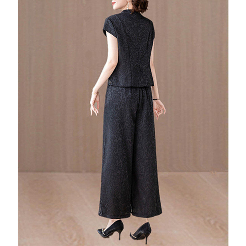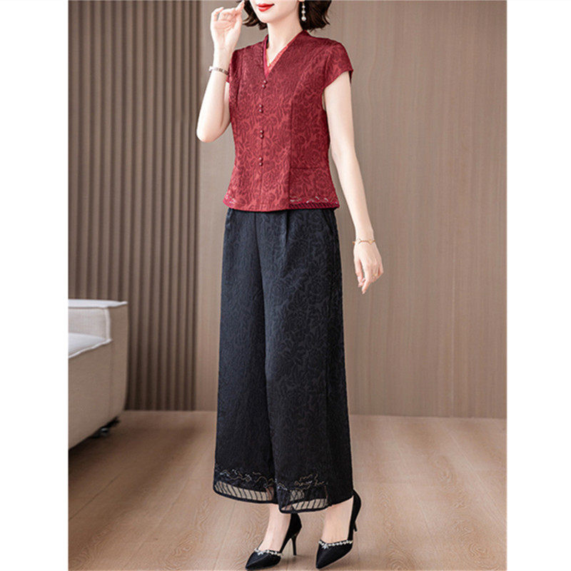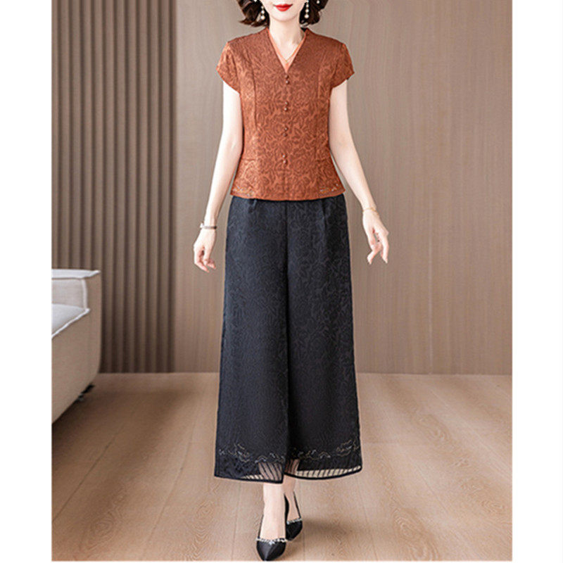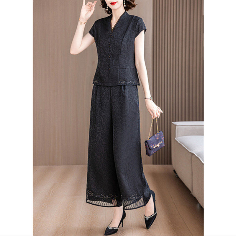 时尚 国风香云纱短袖 套装 妈妈夏装 子两件套 桑蚕丝真丝上衣女阔腿裤