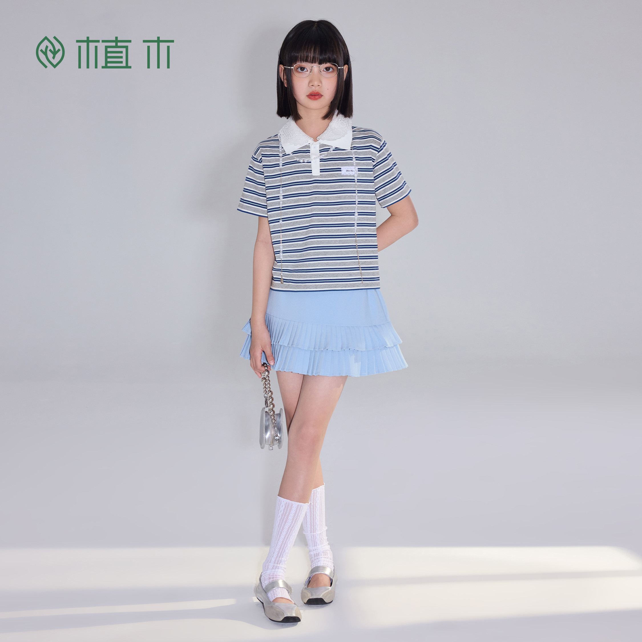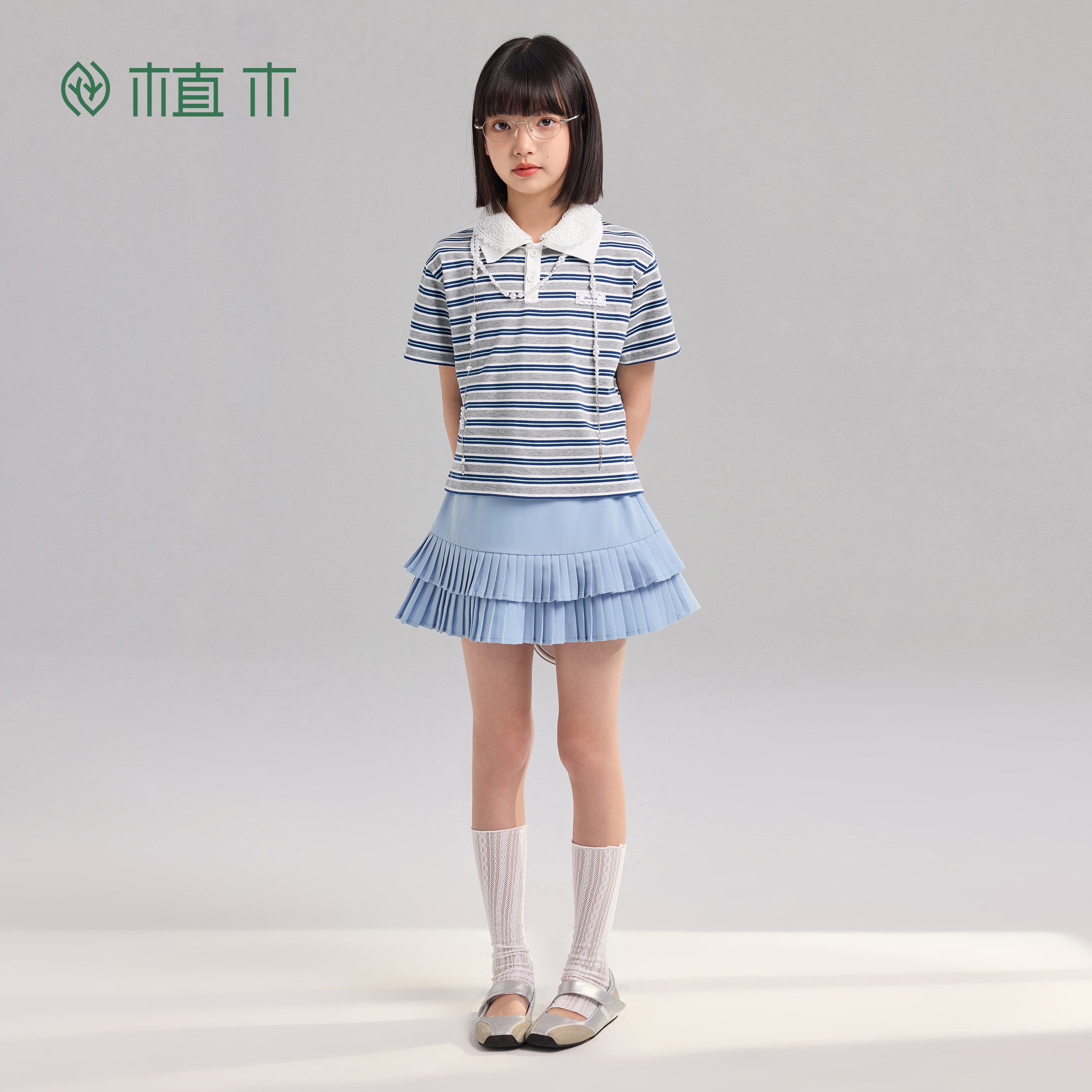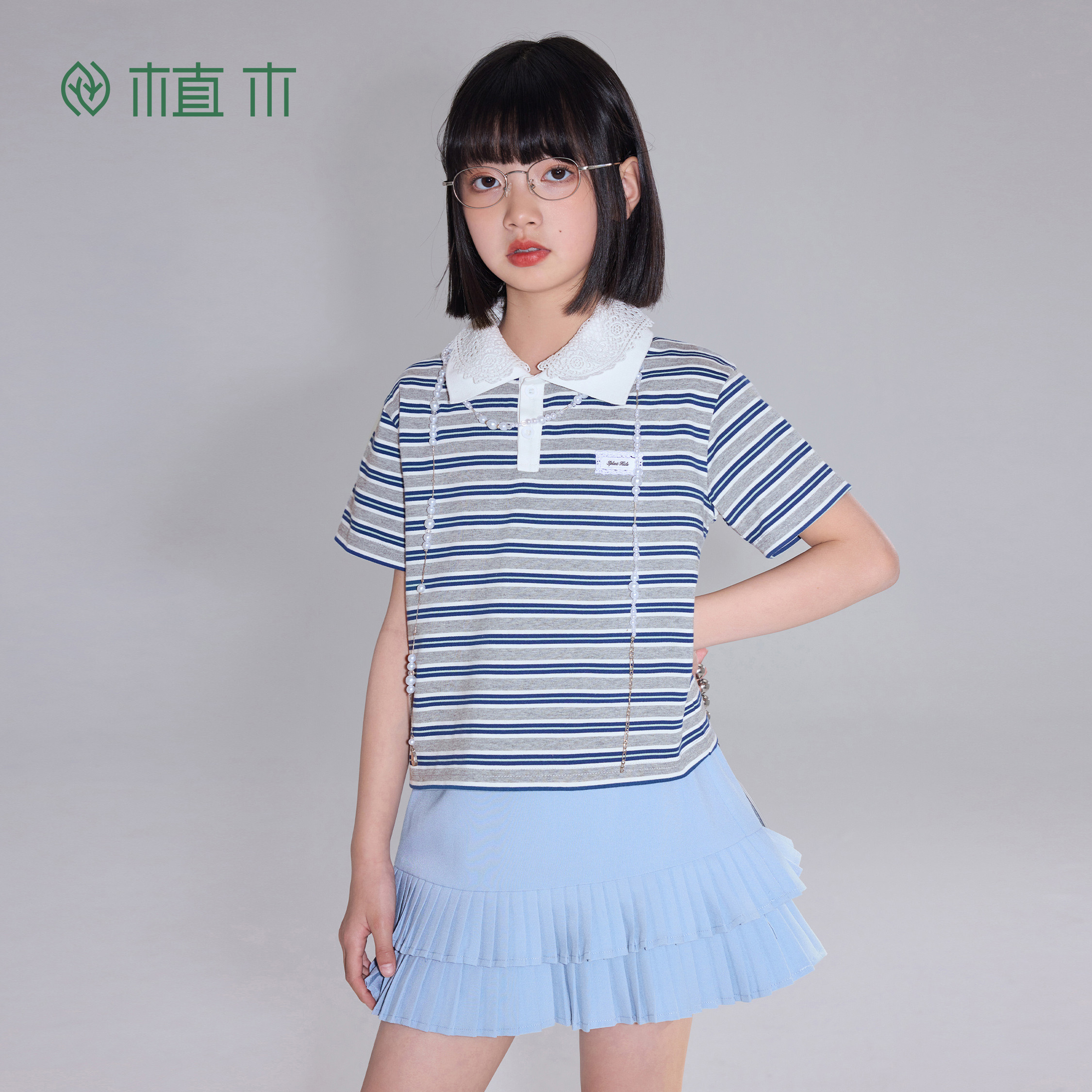 女童短袖 POLO领宽松条纹T恤 风起襟前 青少年夏季 新款 T恤 植木由