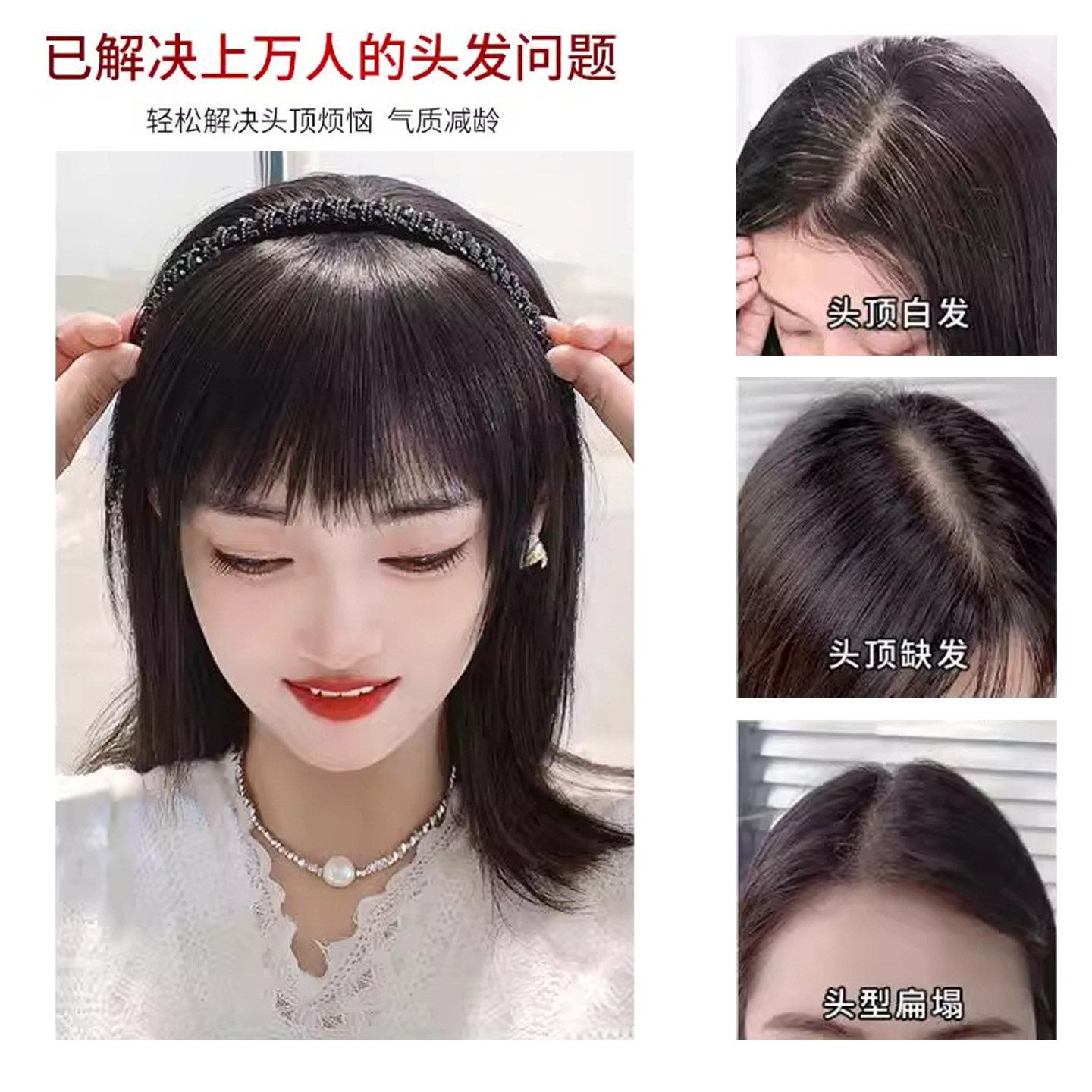 为您提供商品真人发丝自然遮头顶白发轻薄前额补发神器 假发女片刘海发箍一体式的详细介绍,