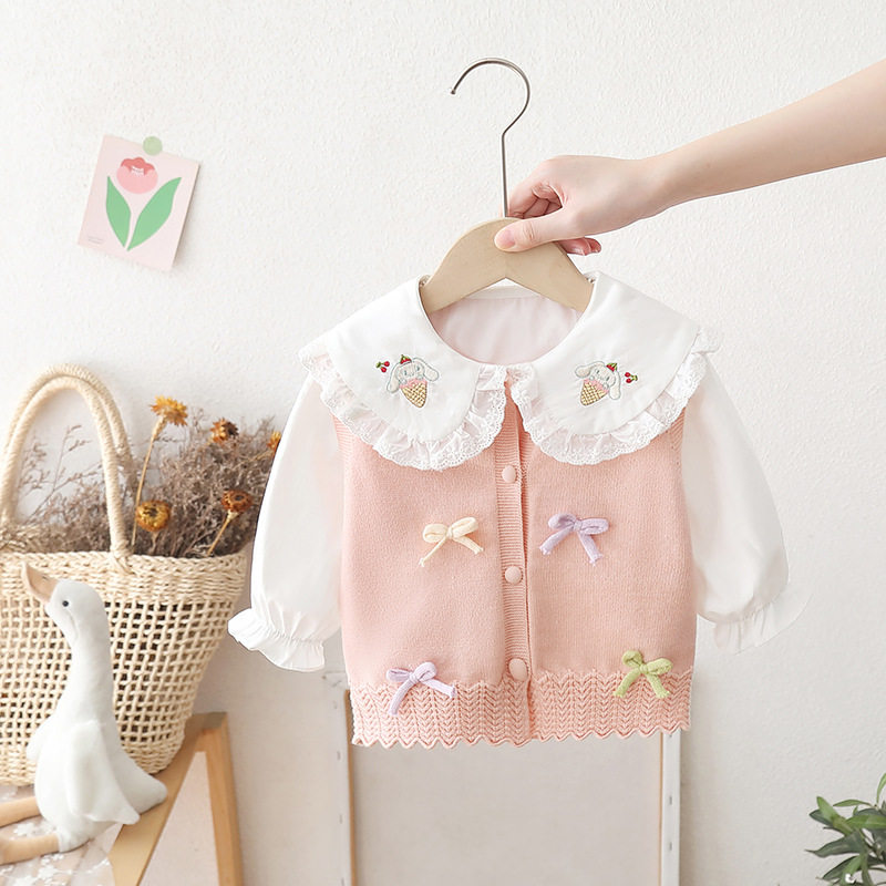 为您提供商品春秋新款 儿童洋气宝宝保暖坎肩毛衣 套装 女童针织马甲背心衬衣开衫的详细介绍,