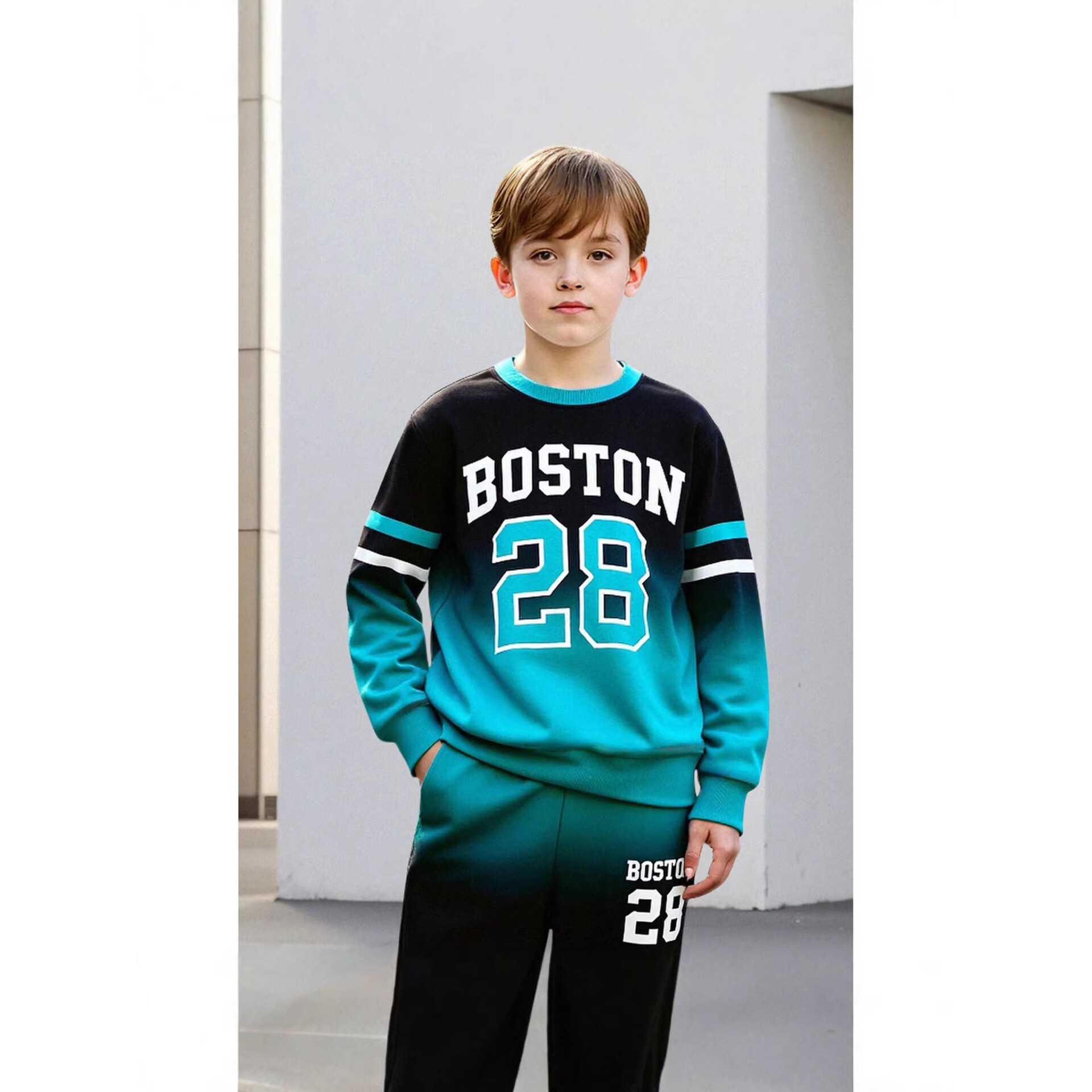 春秋款 新品 新款 男童套装 两件套外贸货 渐变蓝绿撞色数字卫衣束脚裤由