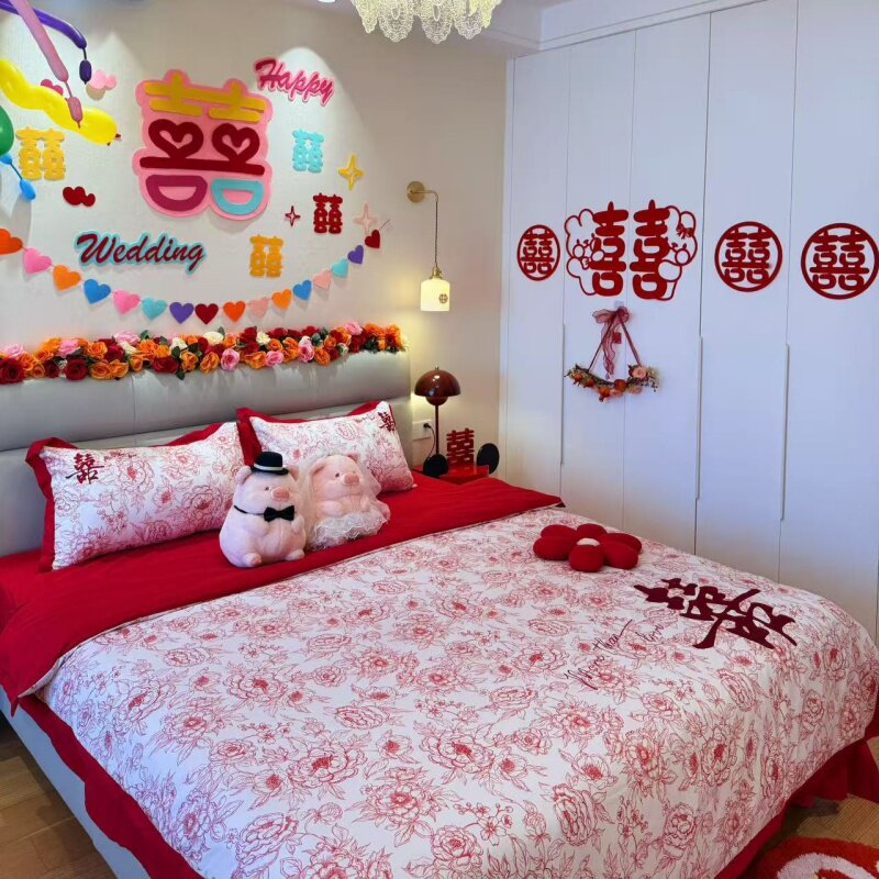 饰被套床单大红色陪嫁床品 结婚喜庆男方卧室婚房布置四件套婚庆装