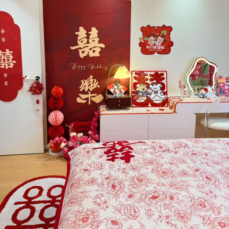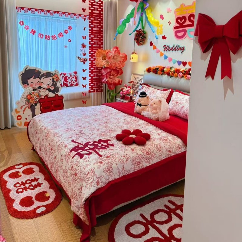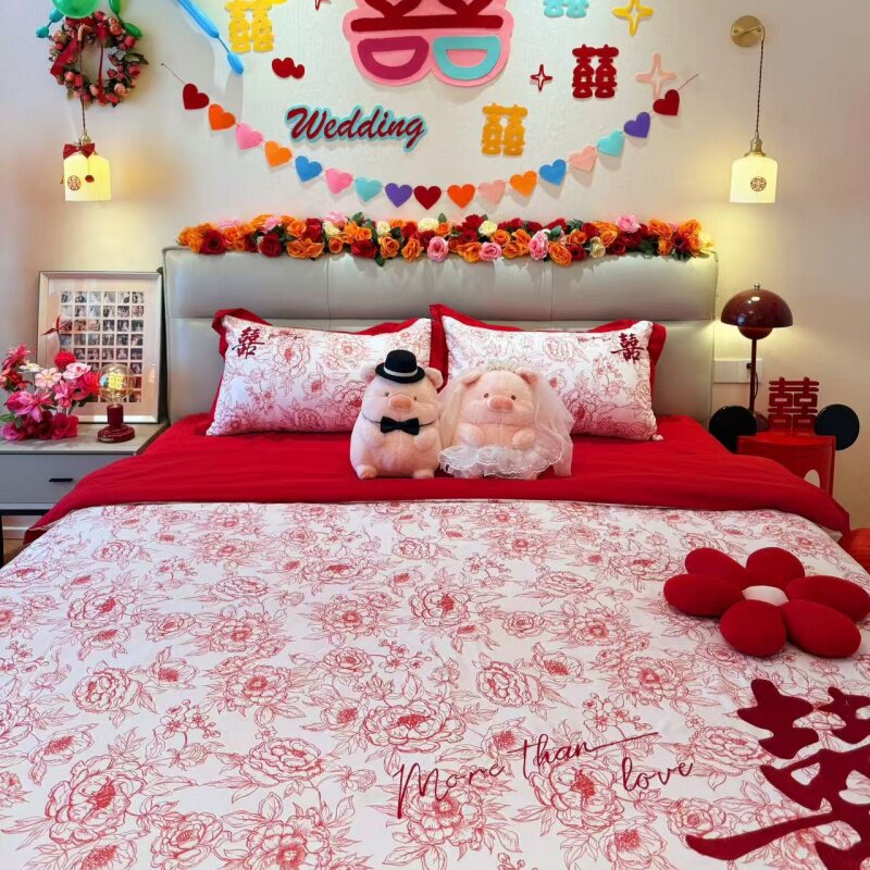 饰被套床单大红色陪嫁床品 结婚喜庆男方卧室婚房布置四件套婚庆装由