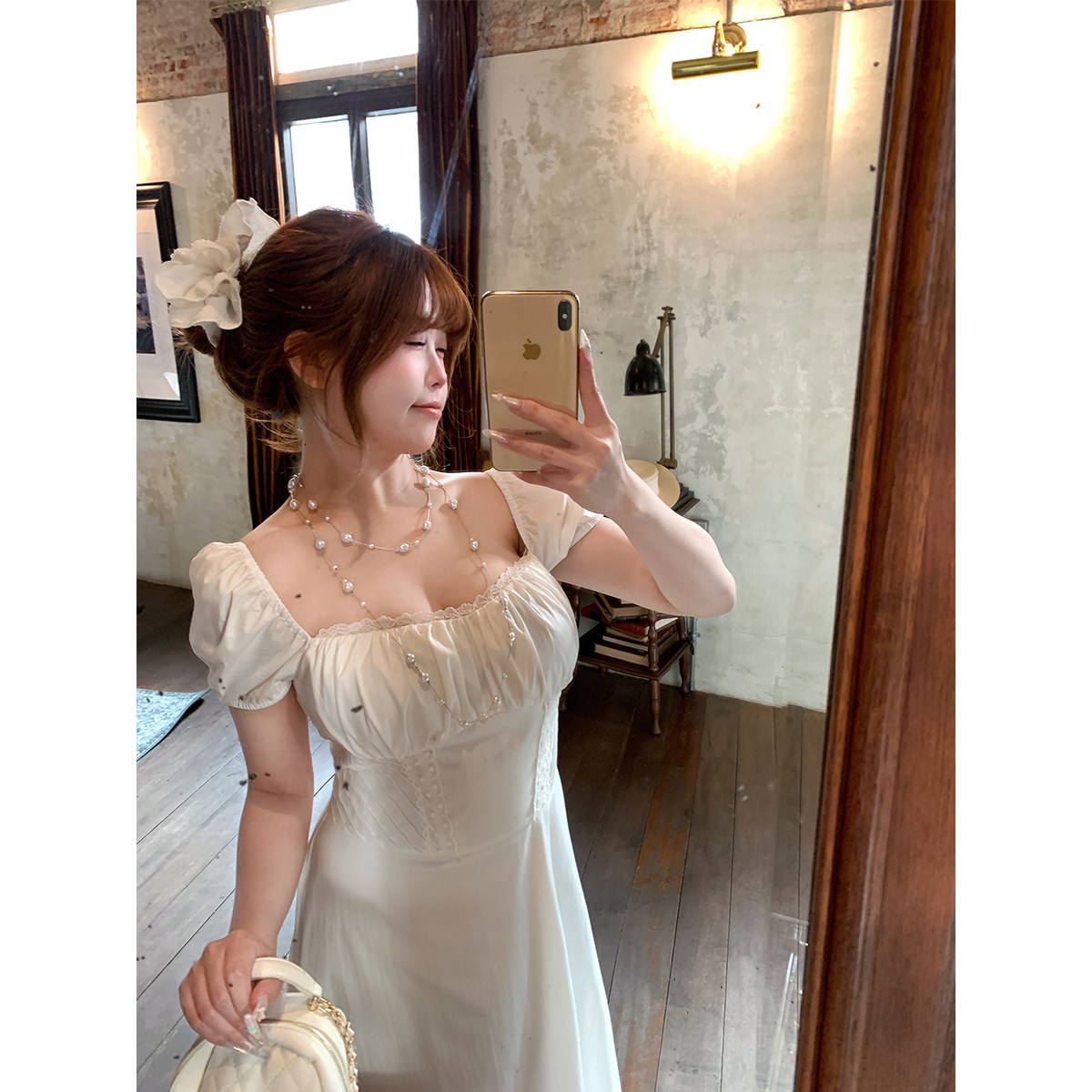 安妮不火初恋感蕾丝花边泡泡袖 小方领收腰裙 棉感小白裙女微胖大码