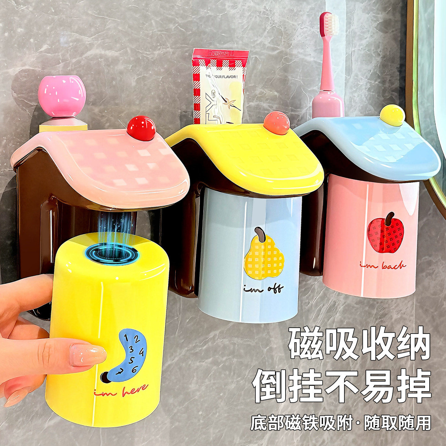 免打孔牙刷架 磁吸漱口杯牙刷杯儿童牙刷置物架卫生间刷牙杯壁挂式
