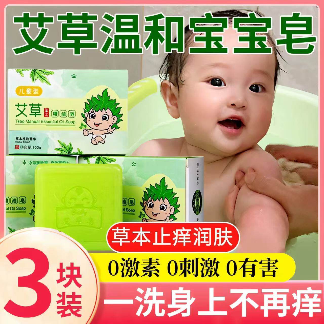 天然艾草手工皂儿童香皂宝宝香皂舒痒皂婴幼儿肥皂洗澡洗头精油皂