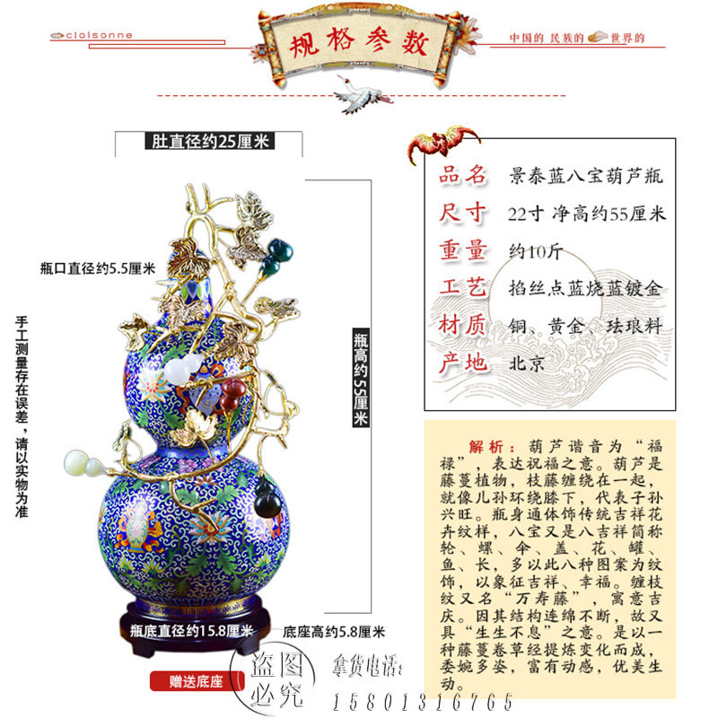 为您提供商品北京景泰蓝花瓶22寸八宝葫芦手工铜胎掐丝珐琅器客厅摆件生日礼品的详细介绍,