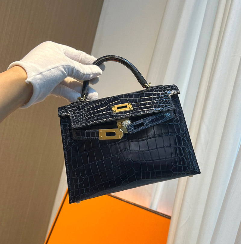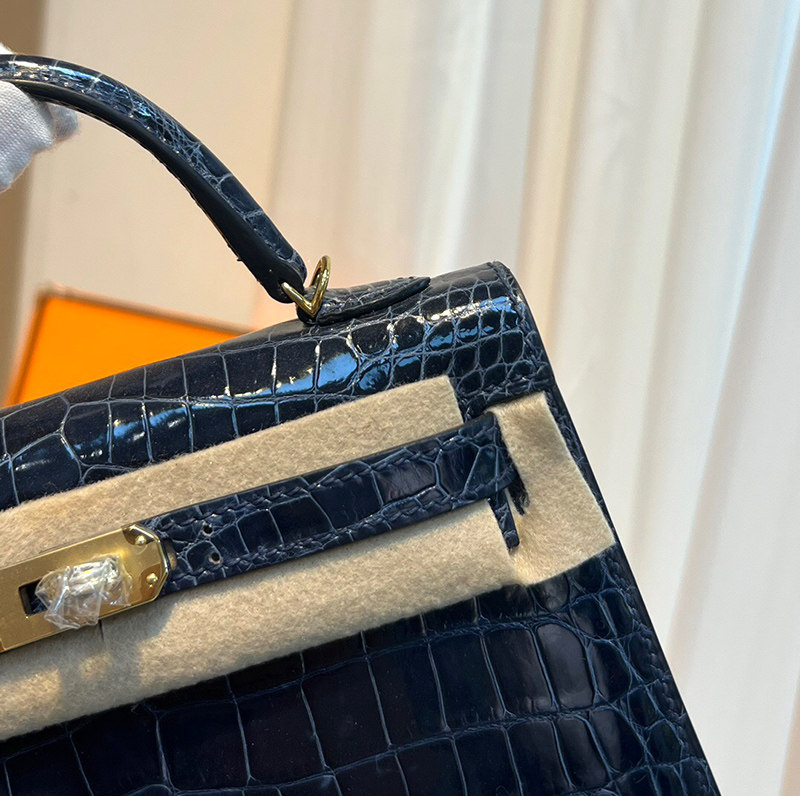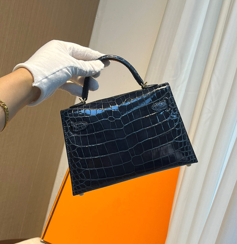 小包 宝蓝色高光亮面尼罗鳄鱼皮mini凯莉包女士小手提单肩斜挎夏季由