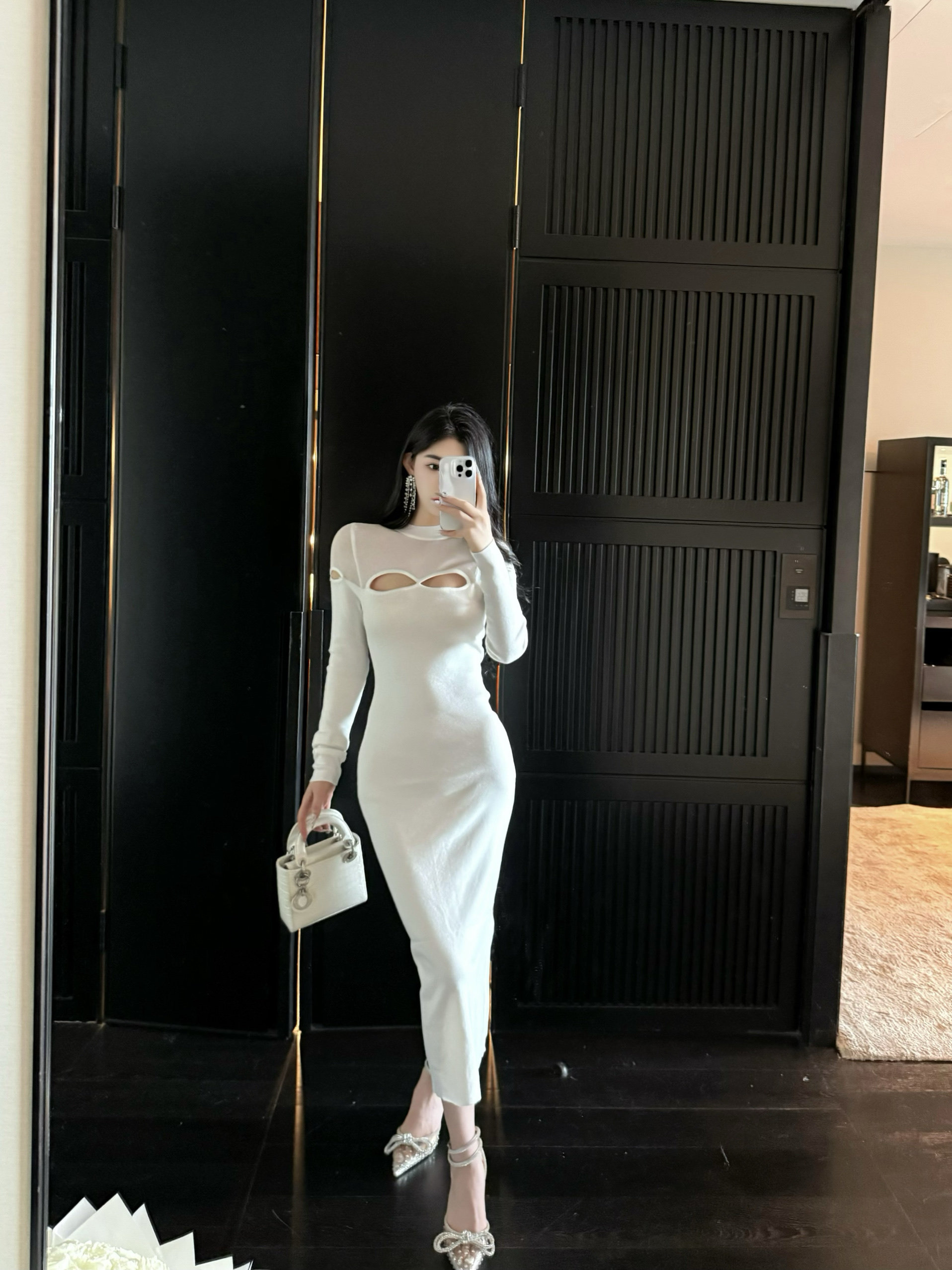 LOCK 镂空女神气质针织紧身包臀连衣裙长裙 KK时髦精透视拼接由