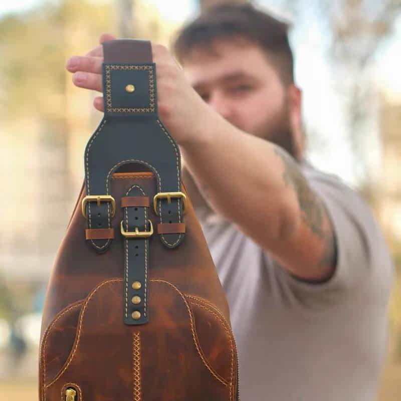 GAOYI植鞣牛皮斜挎包手工擦色背包单肩包真皮男包休闲潮流胸包潮由