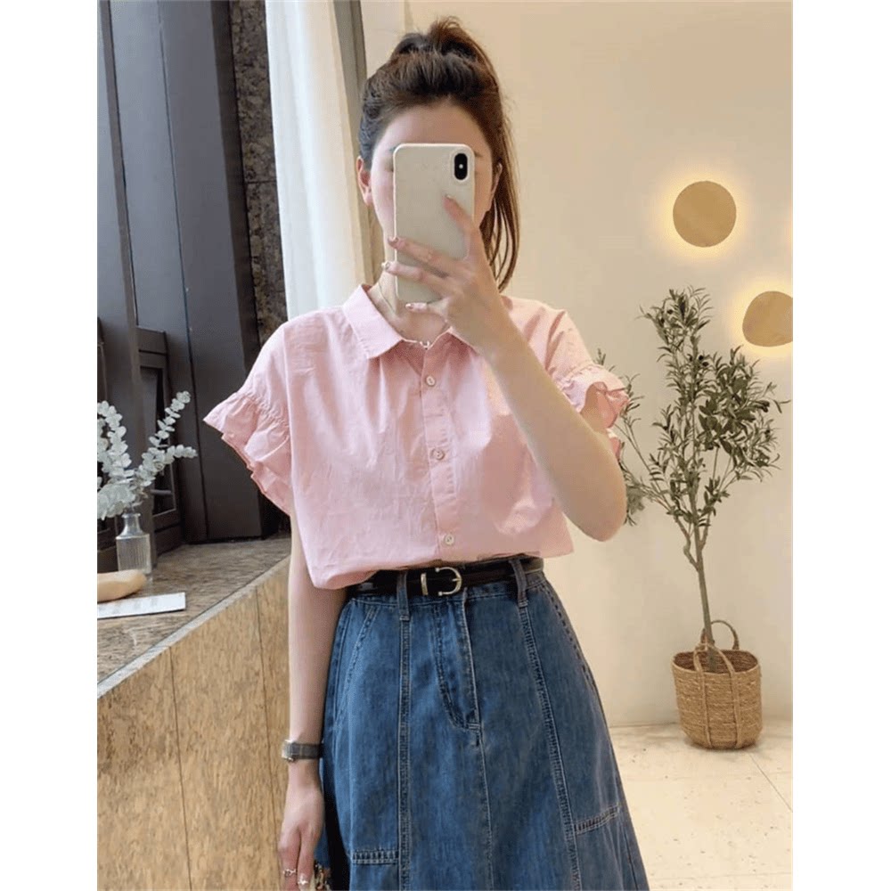 女夏季 法式 小清新polo领荷叶边纯棉短袖 衬衫 休闲宽松百搭上衣 新款