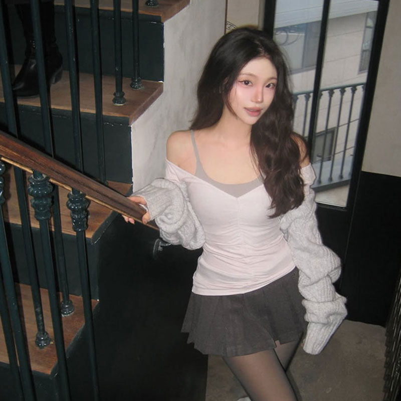 潘白雪张元 Threetim s纯欲v领露肩褶皱长袖 女内搭打底上衣 英同款由