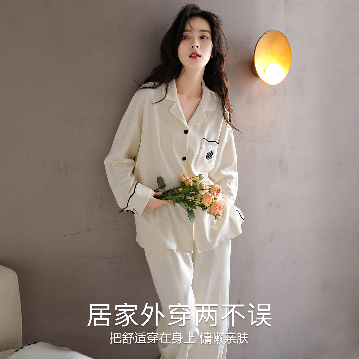 浪莎睡衣女春秋款 2026新款 带胸垫可外穿高级感家居服套装 纯棉长袖
