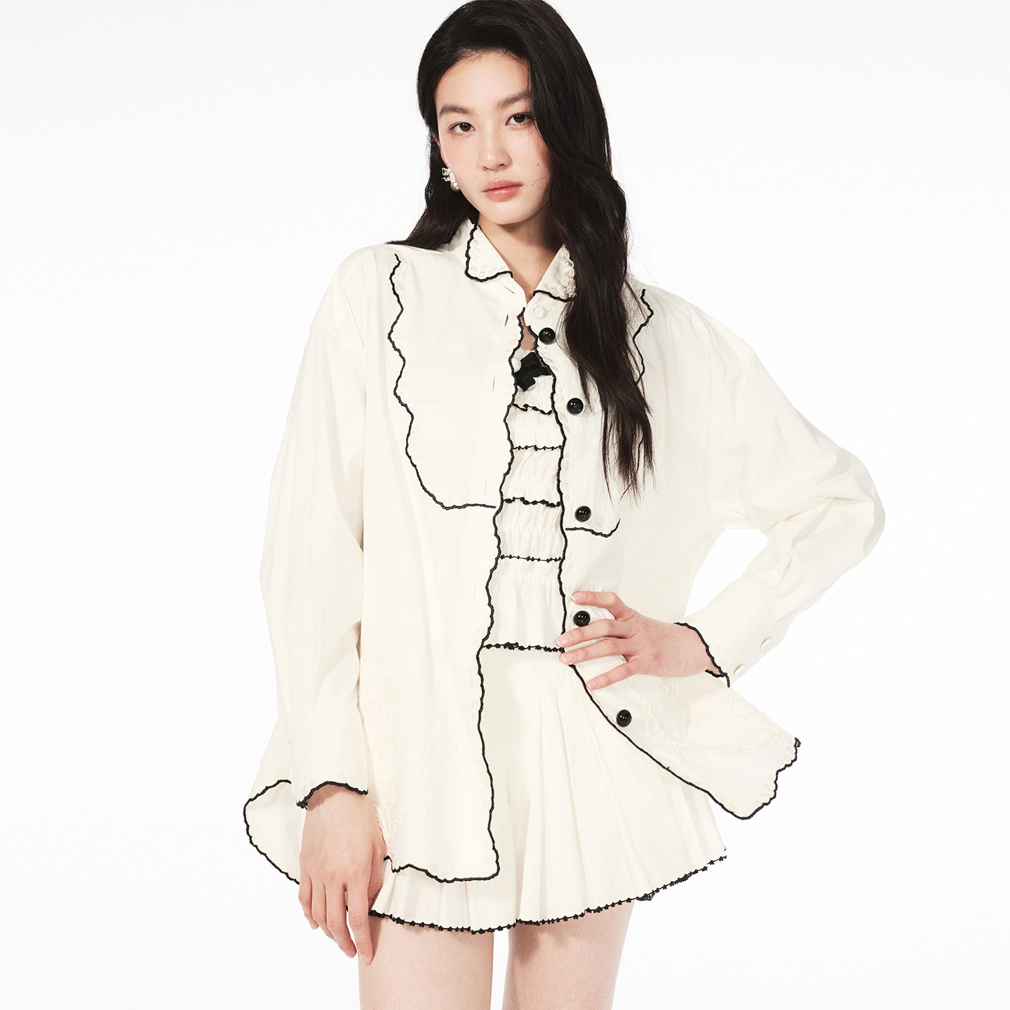 新款 Angelababy同款 lefame拉飞姆2026夏季 撞色边绣花衬衫 时尚由