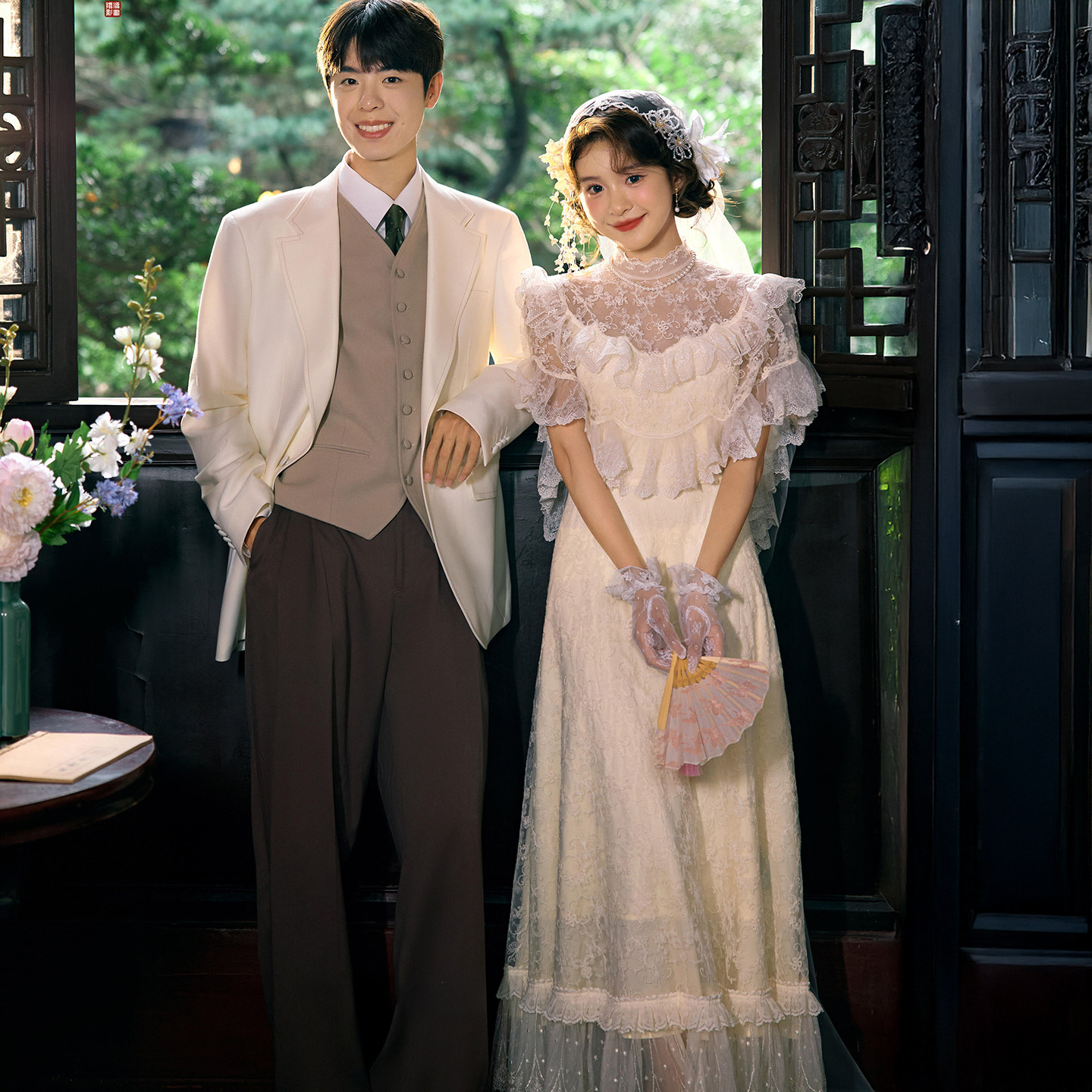 影楼主题服装 情侣写真外景拍照长礼服园林复古风旅拍蕾丝婚纱 新款