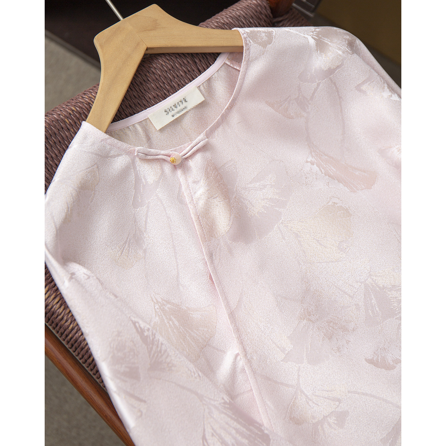 亏清 100%桑蚕丝织金银杏叶提花螺钿正绢真丝上衣女圆领斜襟小衫